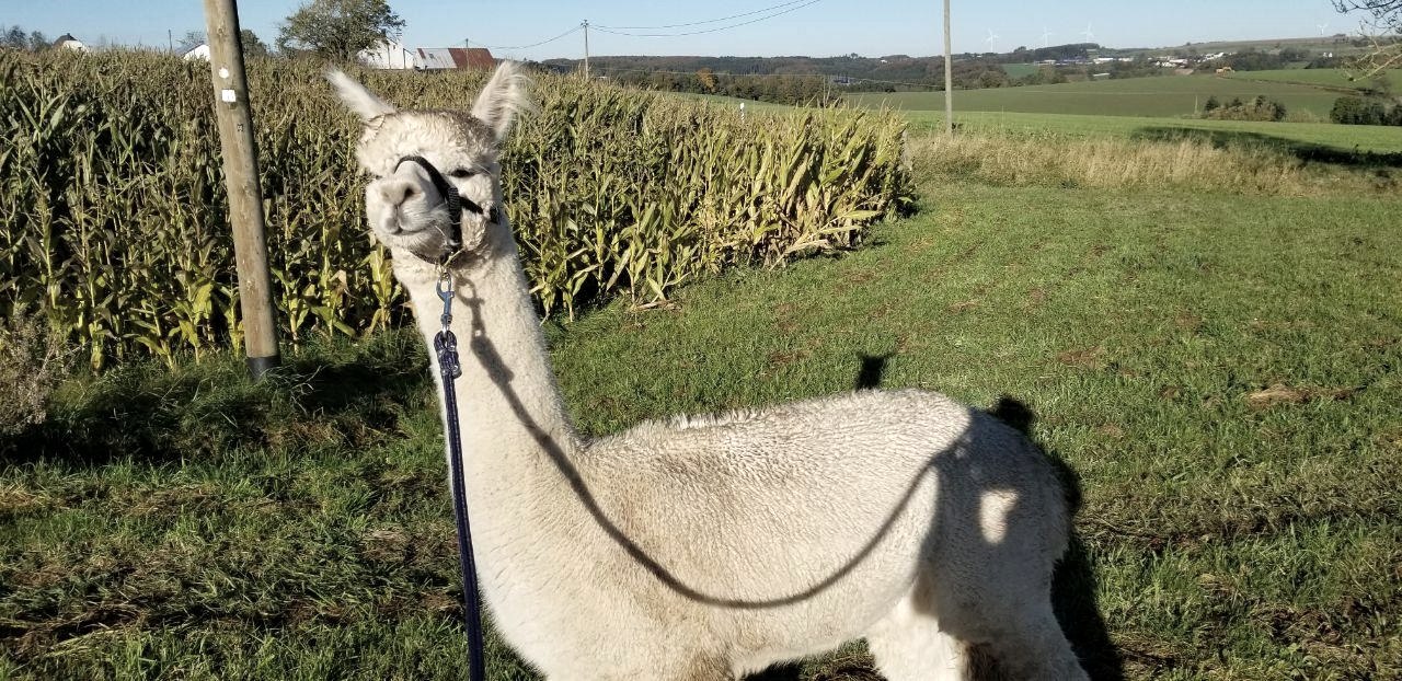 Bei einem Spaziergang geht es über Wiesen und Feldwege hoch und runter, daher bitte feste Schuhe tragen. Die Tour dauert gemütlich eine gute Stunde und es werden Pausen gemacht für Tiere und Menschen. Kinder unter 12 Jahren können an der Seite eines Erwachsenen mitgehen oder sie begleiten denjenigen, der ein Alpaka führt.