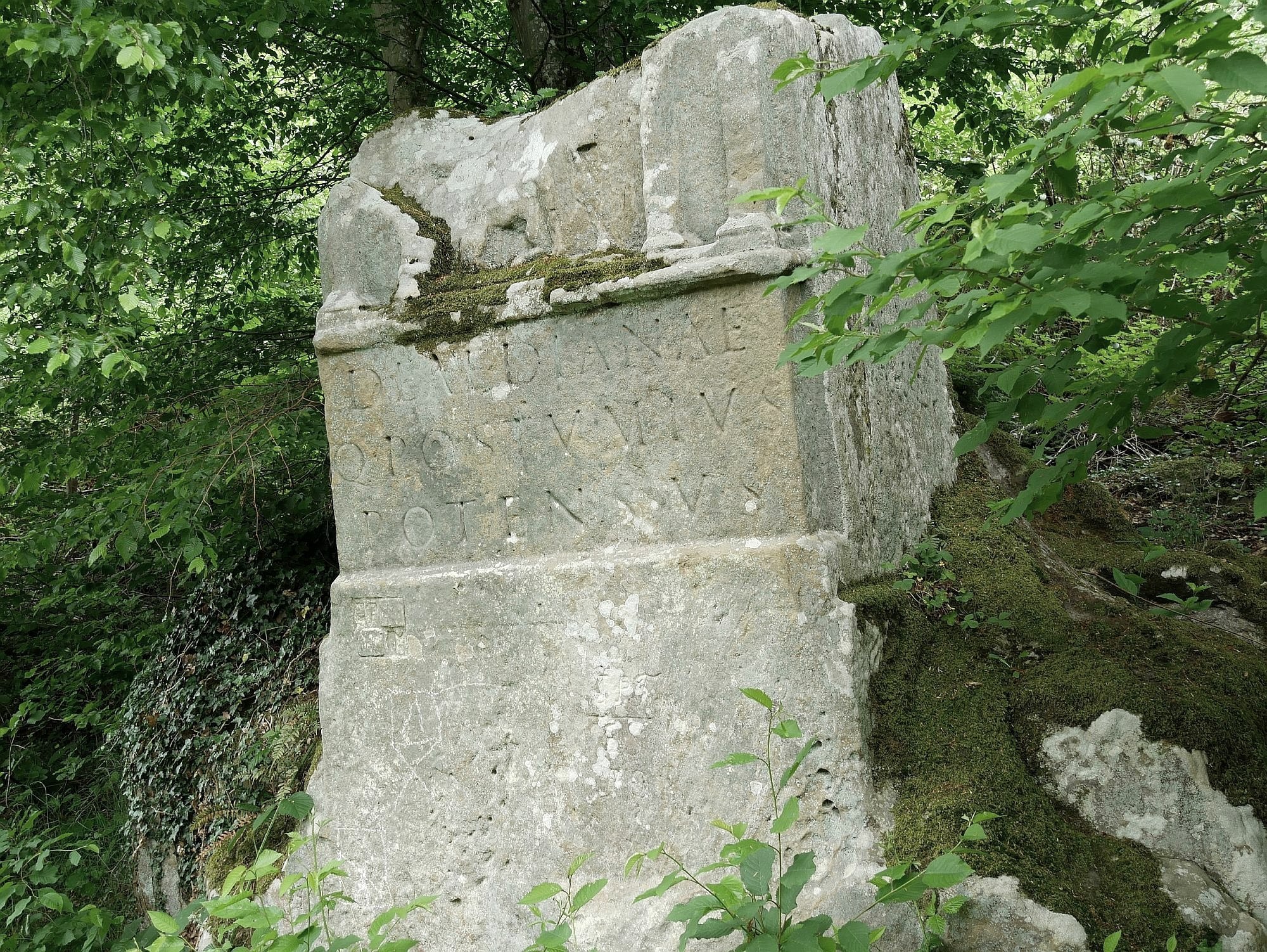 Deae Dianae Q(uintus) Postumius Potens V(otum) S(olvit) - "Der Göttin Diana hat Quintus Postumius Potens (den Stein gewidmet und) das Gelübde erfüllt.". So lautet die Inschrift auf dem Sockel des Denkmals mitten im Wald am Fuß der Niederburg, unweit von Schloss Weilerbach. Warum der Genannte im 2. Jahrhundert hier ein Relief mit Inschrift aus dem gewachsenen Sandsteinfelsen herausarbeiten ließ, ist unbekannt. Vielleicht hat er besonderes Jagdglück oder er rief die Göttin zum Schutz des Waldes an. Diana war, wie in einer Broschüre zu lesen ist, als Hüterin des Waldes und der Jagd eine Art "himmlische Oberförsterin".