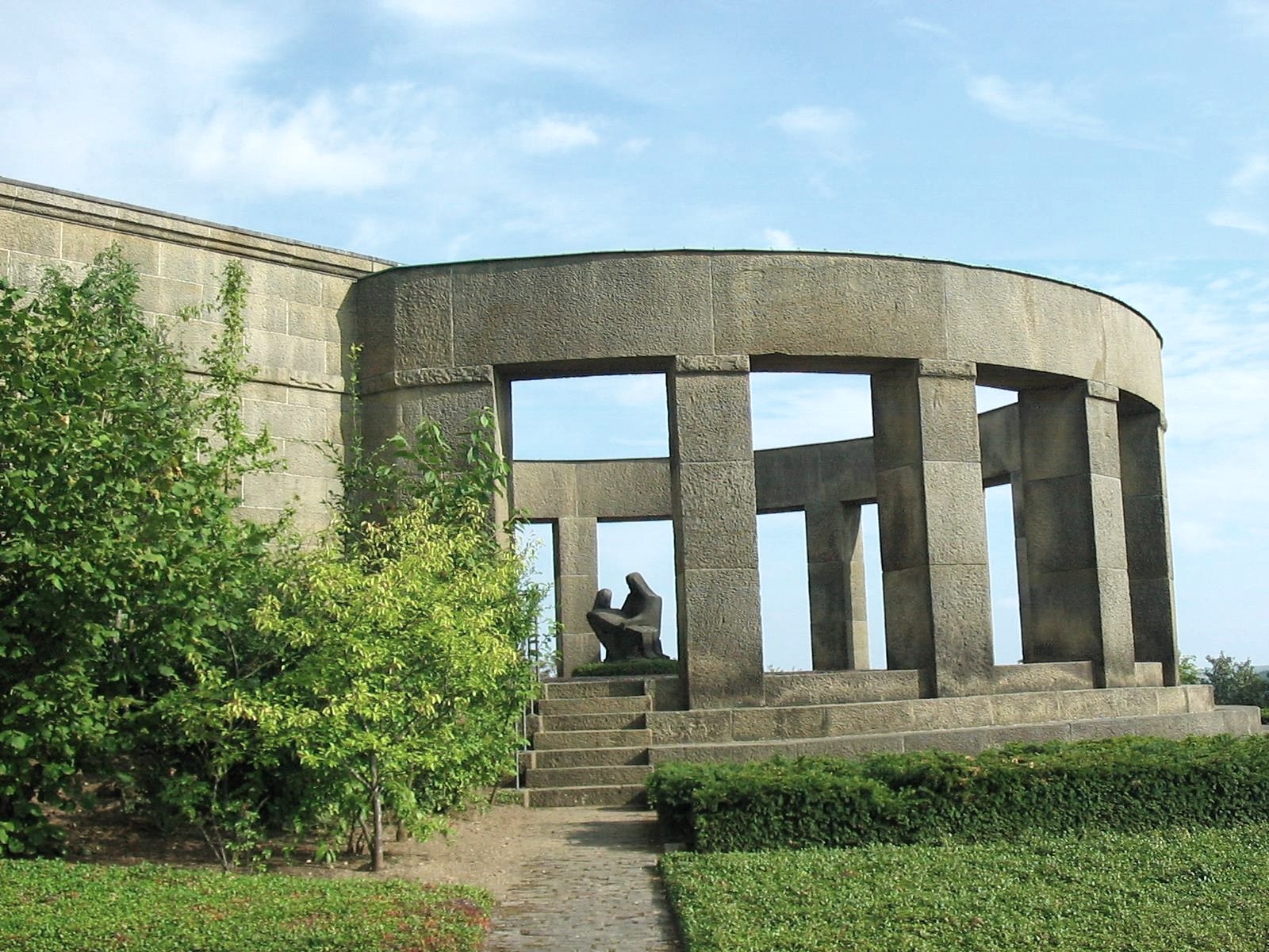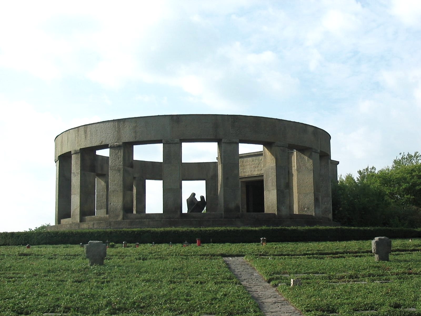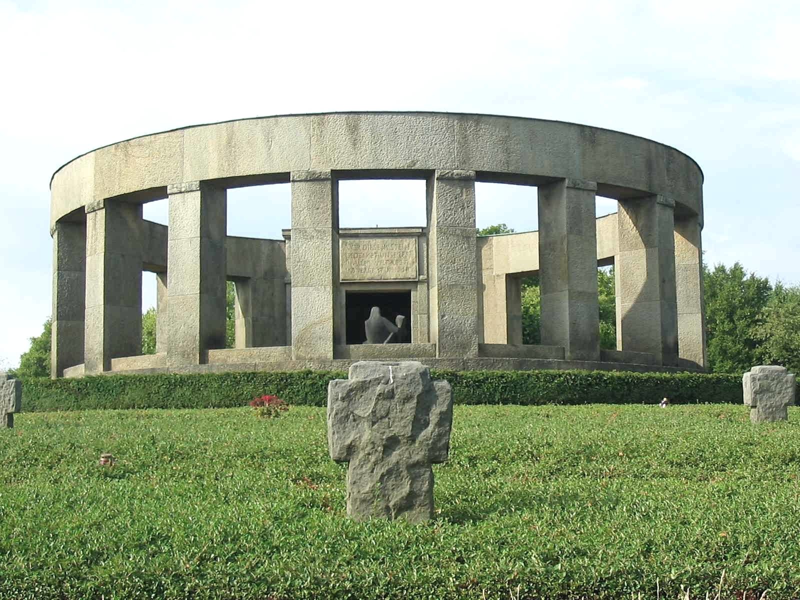 Die Kriegsgräberstätte in Daleiden ist mit über 3000 im Zweiten Weltkrieg Gefallenen der größte Ehrenfriedhof in Rheinland-Pfalz. Die Gefallenen waren bis zur Umbettung nach Daleiden auf 72 kleineren Anlagen der näheren Umgebung bestattet. lm natürlichen Abfall des Hangs sind die Gräberreihen im Verlauf der Höhenschichten eingeordnet, erschlossen durch Umgangs- und Zugangswege zu den einzelnen, mit einem Namensstein versehenen Gräbern. Eine Stützmauer mit Wall schließt die Gräberfläche nach außen ab. Kreuzwegstationen führen zur Friedhofsanlage. Der Ehrenfriedhof wurde - anstelle einer kleinen, barocken Wegekapelle - auf einer Anhöhe östlich des Ortes in den Jahren 1954 - 59 zum Gedenken an die im Eifel-Ardennen-Raum gefallenen Soldaten des 2.Weltkriegs angelegt. Die in mehreren ringförmigen Reihen angelegten Gräber von 3 224 Soldaten laufen auf einen offenen Gedenkraum im Zentrum des Rings zu. Die Gedenkstätte selbst wurde als Pfeilerrotunde gestaltet, in deren Mitte sich eine steinerne Pietà in expressiven Formen befindet. Eine Gedenkhalle mit den Namen der Gefallenen schließt an die Rotunde an.