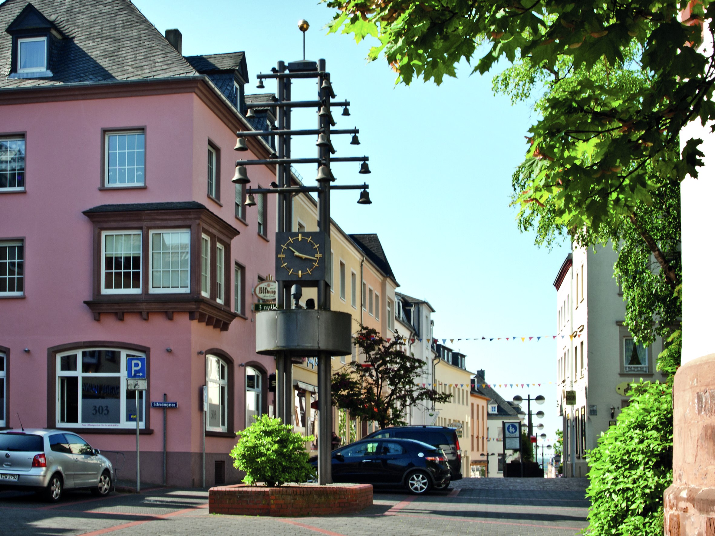Am oberen Ende der Fußgängerzone steht der Glockenspielturm (Höhe 9 Meter), der vom Gewerbeverein Bitburg gespendet wurde. Seine 18 Bronzeglocken spielen ausgewählte Lieder, die zur jeweiligen Jahreszeit passen. Während des Glockenspiels sind sechs Tonfiguren zu sehen, die vom Bitburger Künstler Roger Delleré erstellt wurden. Sie zeigen das handwerkliche Leben in Bitburg: Brauer, Schreiner, Bäcker, Fleischer, Schlosser und Zimmermann.