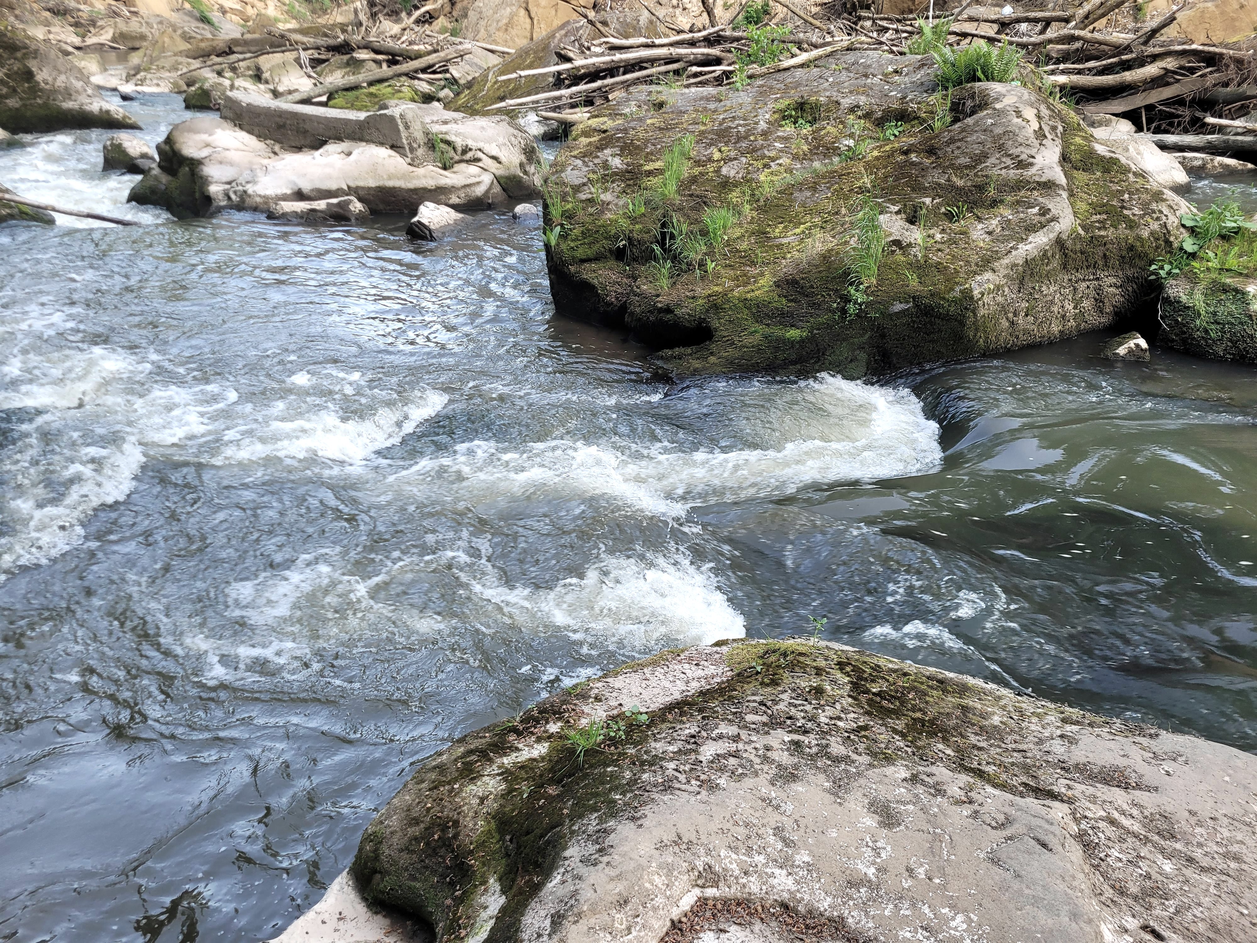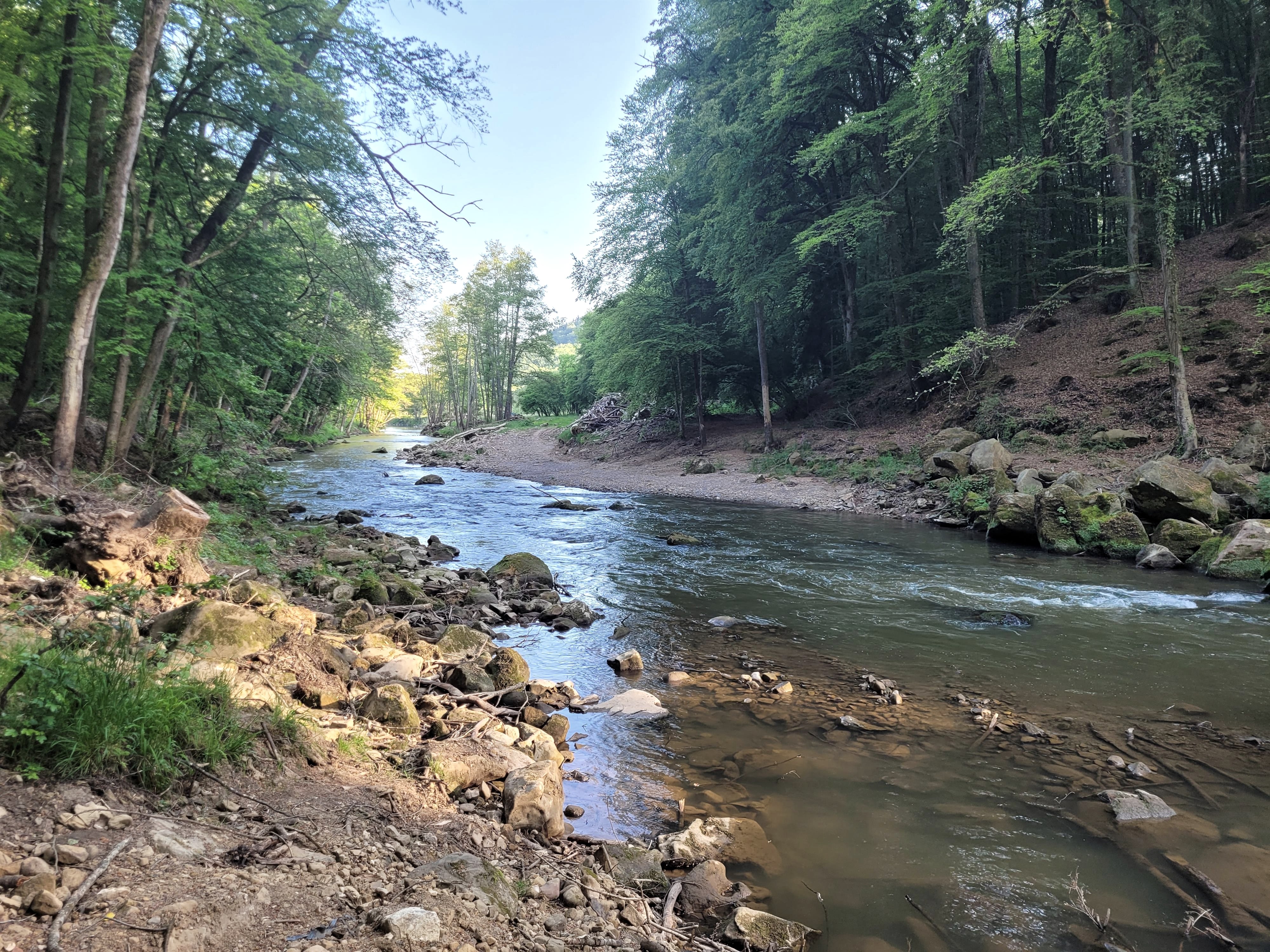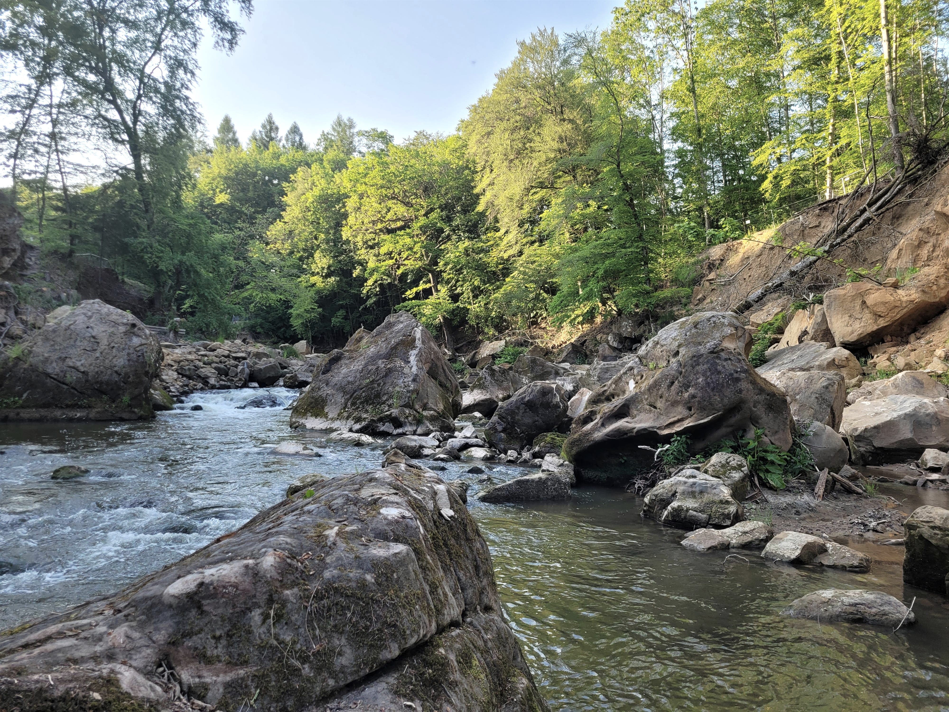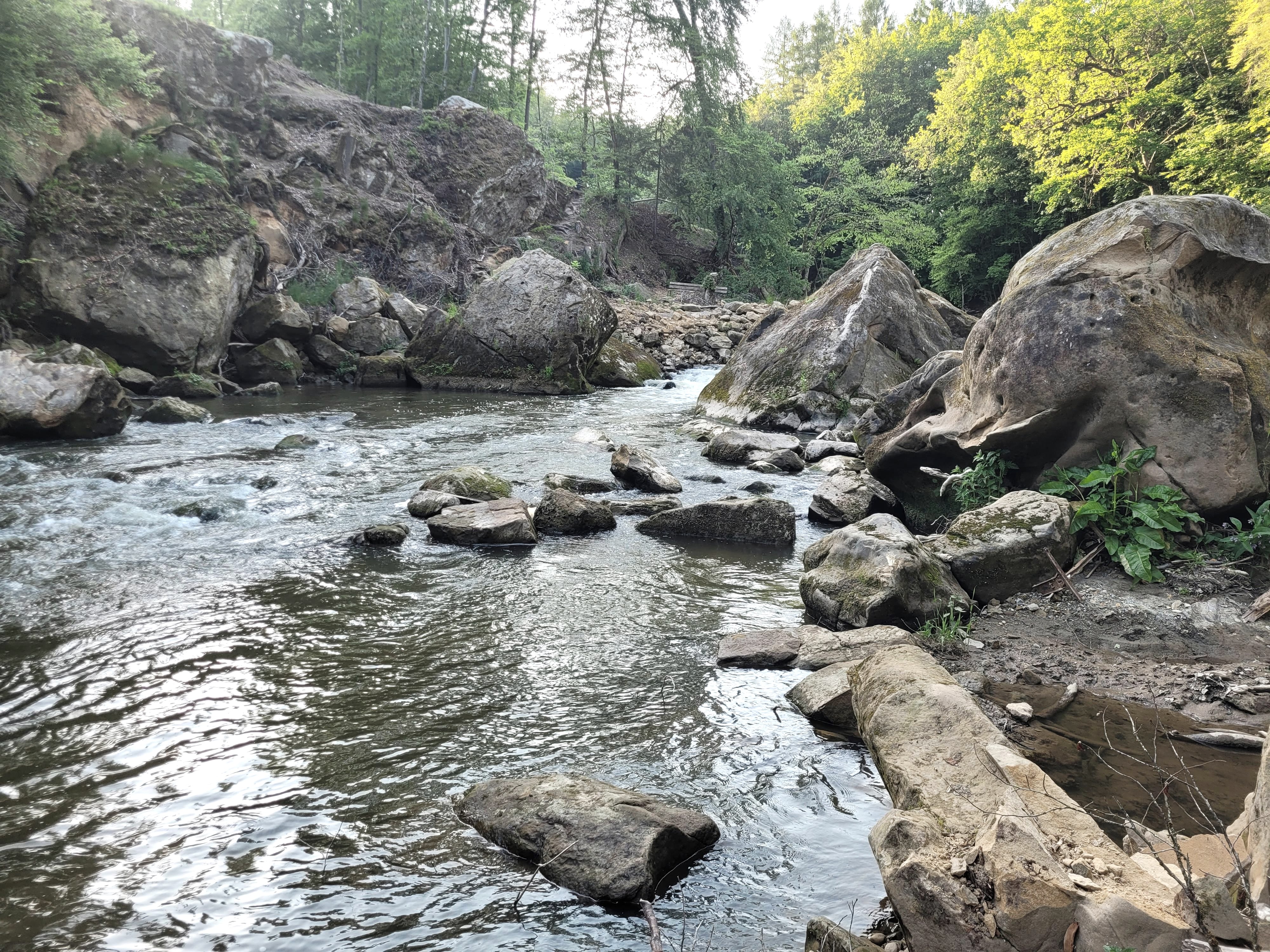 Häufig liest und hört man, die "Irreler Wasserfälle", die imposanten Stromschnellen der Prüm, gäbe es seit der Flutkatastrophe 2021 nicht mehr. Tatsächlich hat das Hochwasser in der Talenge, die der Fluss zwischen Irrel und Prümzurlay durchfließt, mehr als deutliche Spuren hinterlassen: Die Wassermassen haben nicht nur die überdachte Wanderbrücke zerstört, sondern auch ganze Felsblöcke verschoben, enorme Hangrutschungen verursacht, das Flussbett stark verändert und ein Meer von Steinen und Sand, entwurzelten Bäumen und Treibgut hinterlassen. Doch hat der Ort nichts von seiner Faszination verloren.
