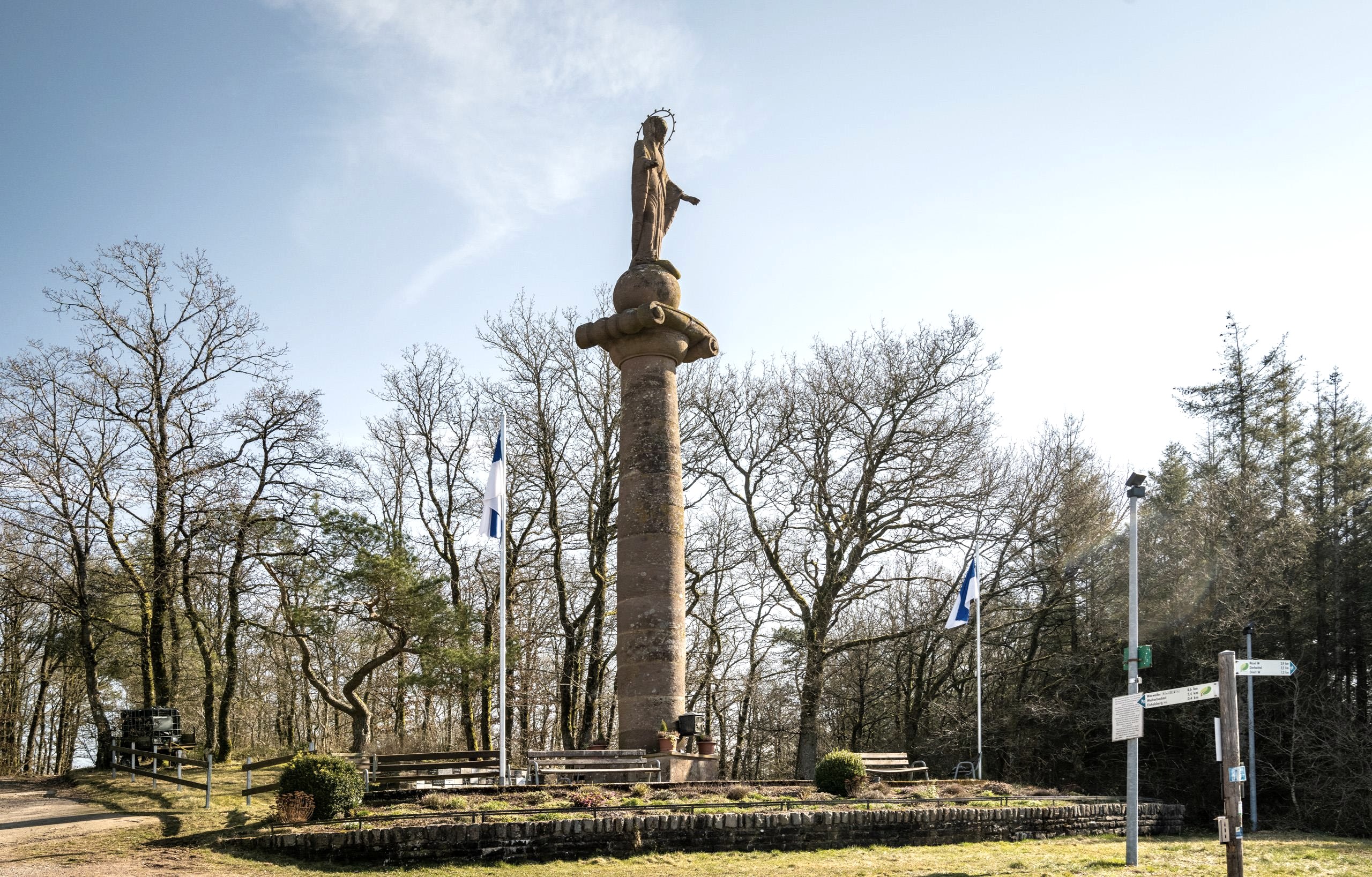 Die benötigten Sandsteinblöcke stammen aus den Neidenbacher Steinbrüchen. Mit Pferdefuhrwerk wurden die 13 Rundblöcke und die Statue auf den Eichelsberg transportiert. Die beiden schweren Sockelsteine wogen jeder etwa 66 Zentner (3,3 t). Zum Aufrichten der Säule wurde vor Ort ein Gerüst aus sechs Stämmen von mehr als 20m Höhe erreichtet, an dem ein Flaschenzug hing. 20 Monate dauerte es, bis dieses beispielhafte Gemeinschaftswerk der Bevölkerung vollendet werden konnte. Am 9. Mai 1948, dem Tag der kirchlichen Einsegnung und der weltlichen Übergabe des Denkmals an die Katholische Kirchengemeinde Waxweiler, pilgerten mehrere hundert Personen in feierlicher Prozession auf den Eichelsberg. Eine Beleuchtung wurde 1949/50 installiert, die Erdverkabelung der Lichtleitung erfolgte 1956.