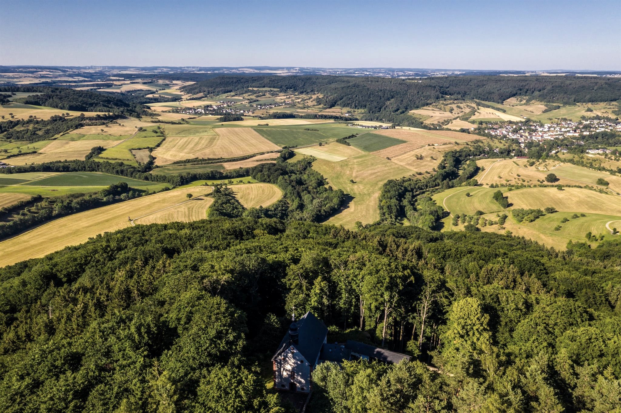 Im Nordosten des Ferschweiler Plateaus, oberhalb der Dörfer Schankweiler und Holsthum, liegt eine schlichte kleine Kirche mitten im Wald. Zwei Tafeln an der Fassade überliefern ihr Erbauungsjahr, die Inschrift und die Nischenfigur über dem Portal weisen auf ihre Patronin hin: 1762 wurde die heutige Wallfahrtskapelle Maria Hilf auf der Schankweiler Höhe errichtet. Sie war nicht der erste Bau an dieser Stelle; schon 1648 wird eine Kapelle mit der zugehörigen Klause erwähnt.