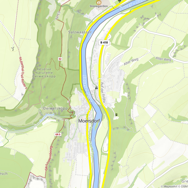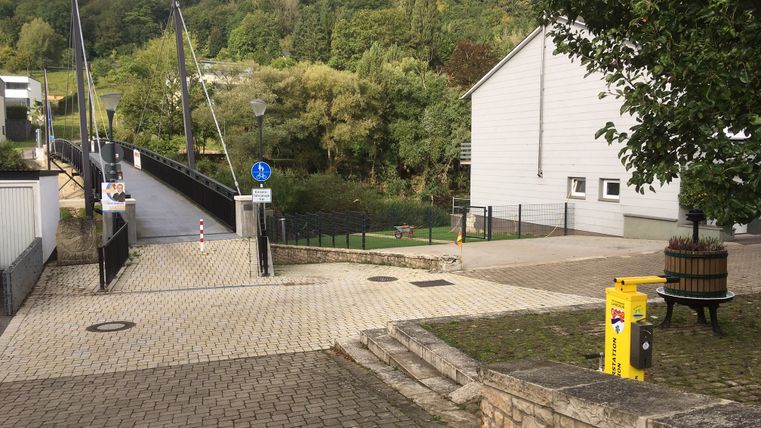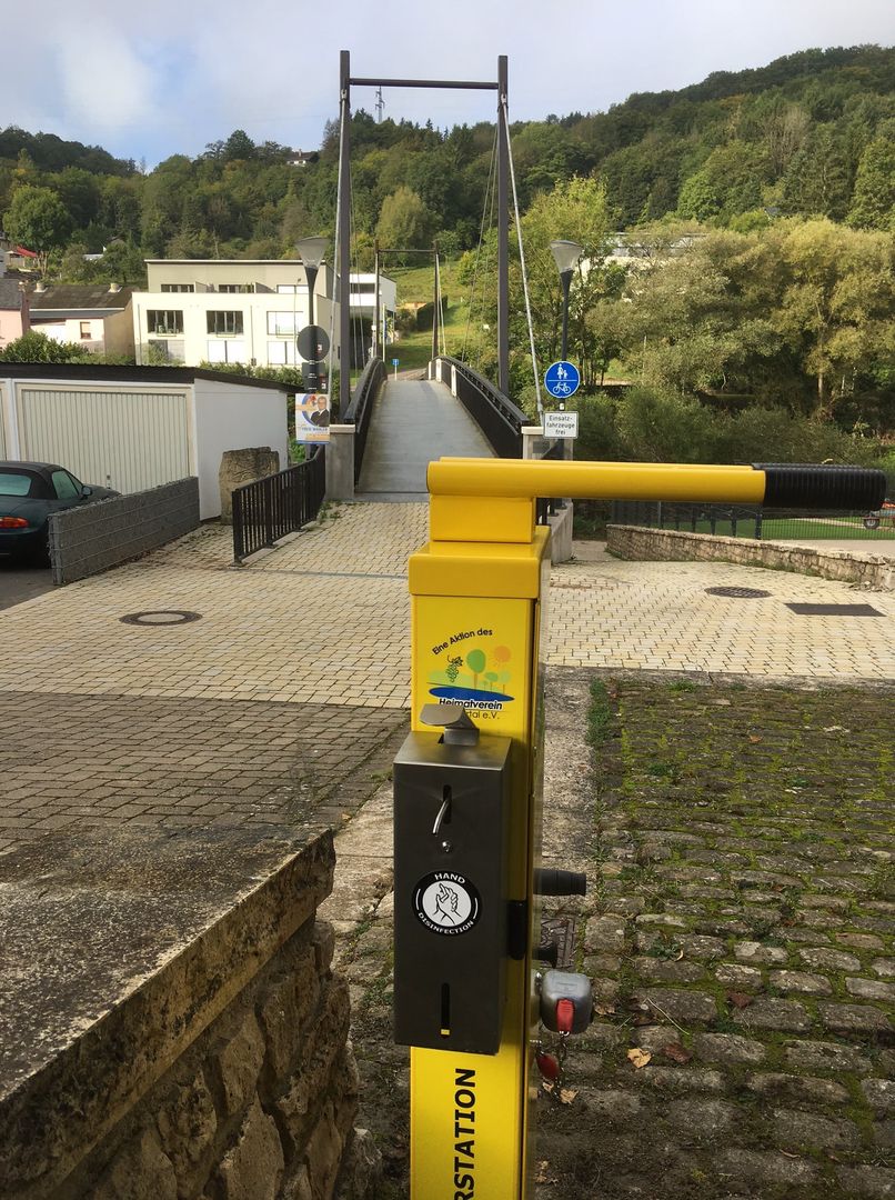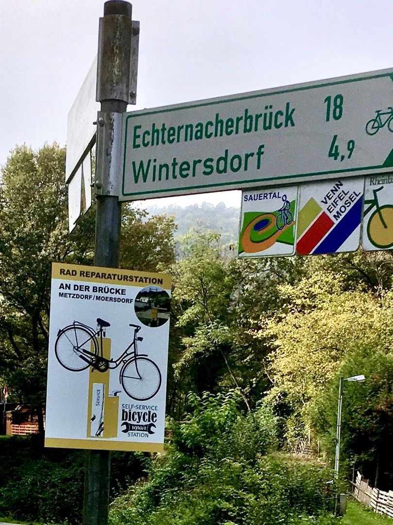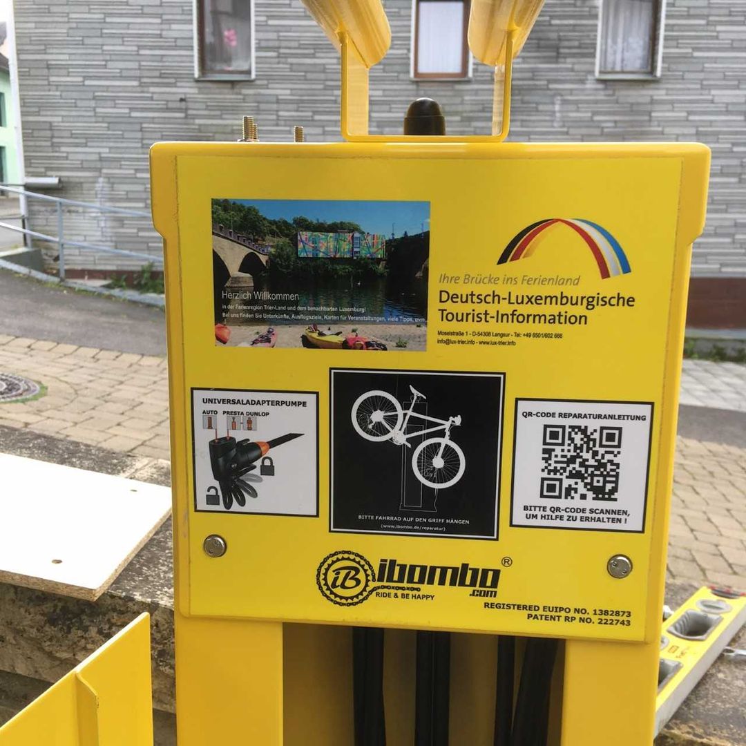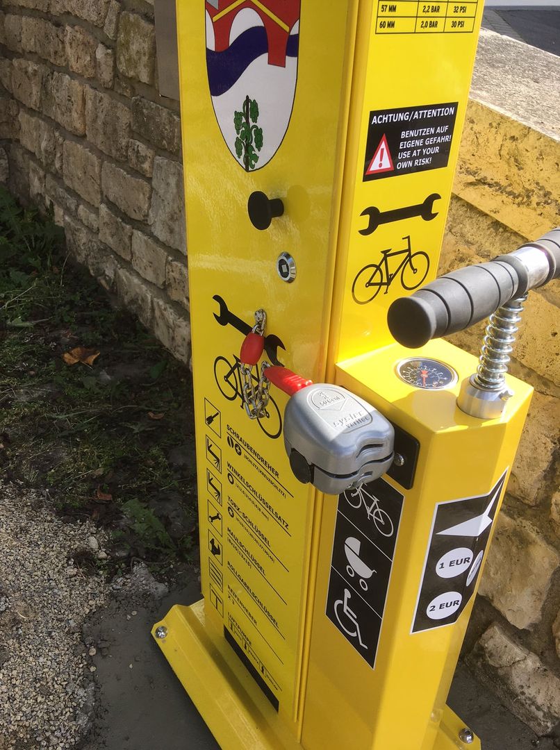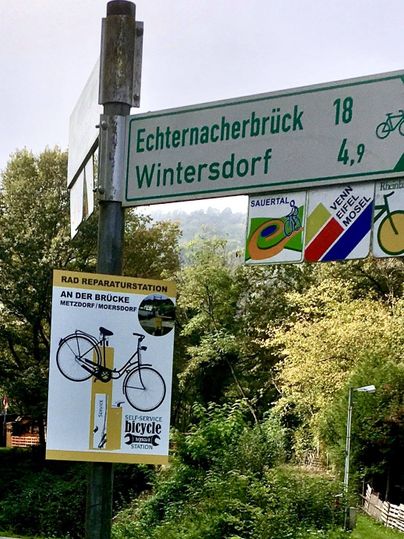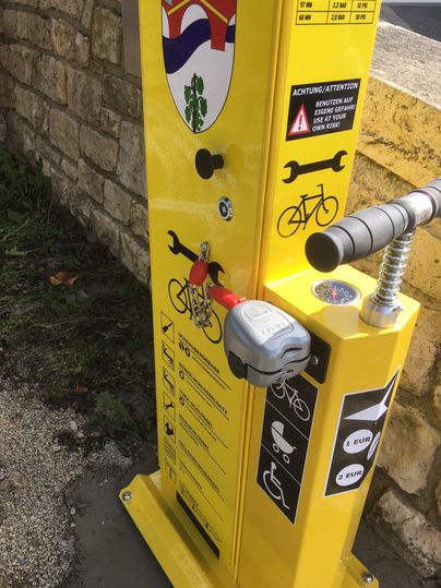 The bicycle repair station on the ´Sauerradweg´ , is located near a bridge for bicycles and pedestrians connecting Metzdorf (D) and Moersdorf (LU).
