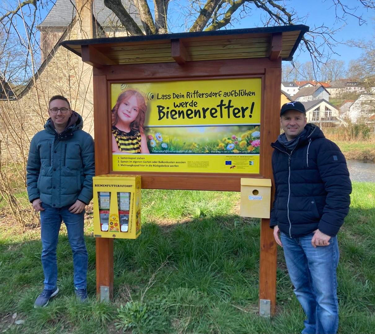 The best things often come from spontaneous ideas. This was probably the case when Michael Heinen and Thomas Schrodt decided to do something for the environment and founded the “Rittersdorf blüht auf” group. One of their first projects in 2021 was to build a bee feeder. It is based on an old chewing gum machine that was converted by the company “Better World Machines” from Dortmund. Instead of the sweet treat, plastic capsules containing flower seeds can now be pulled out of the machine for 50 cents. Once sown, colorful flowers can grow, whose nectar serves as food for the bees. Translated with DeepL.com (free version)