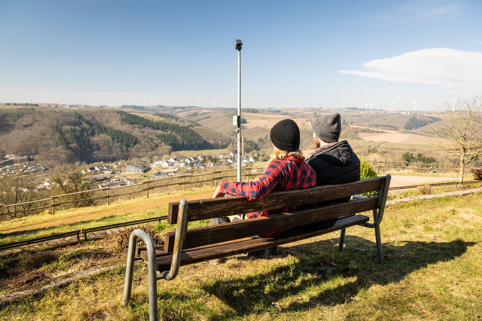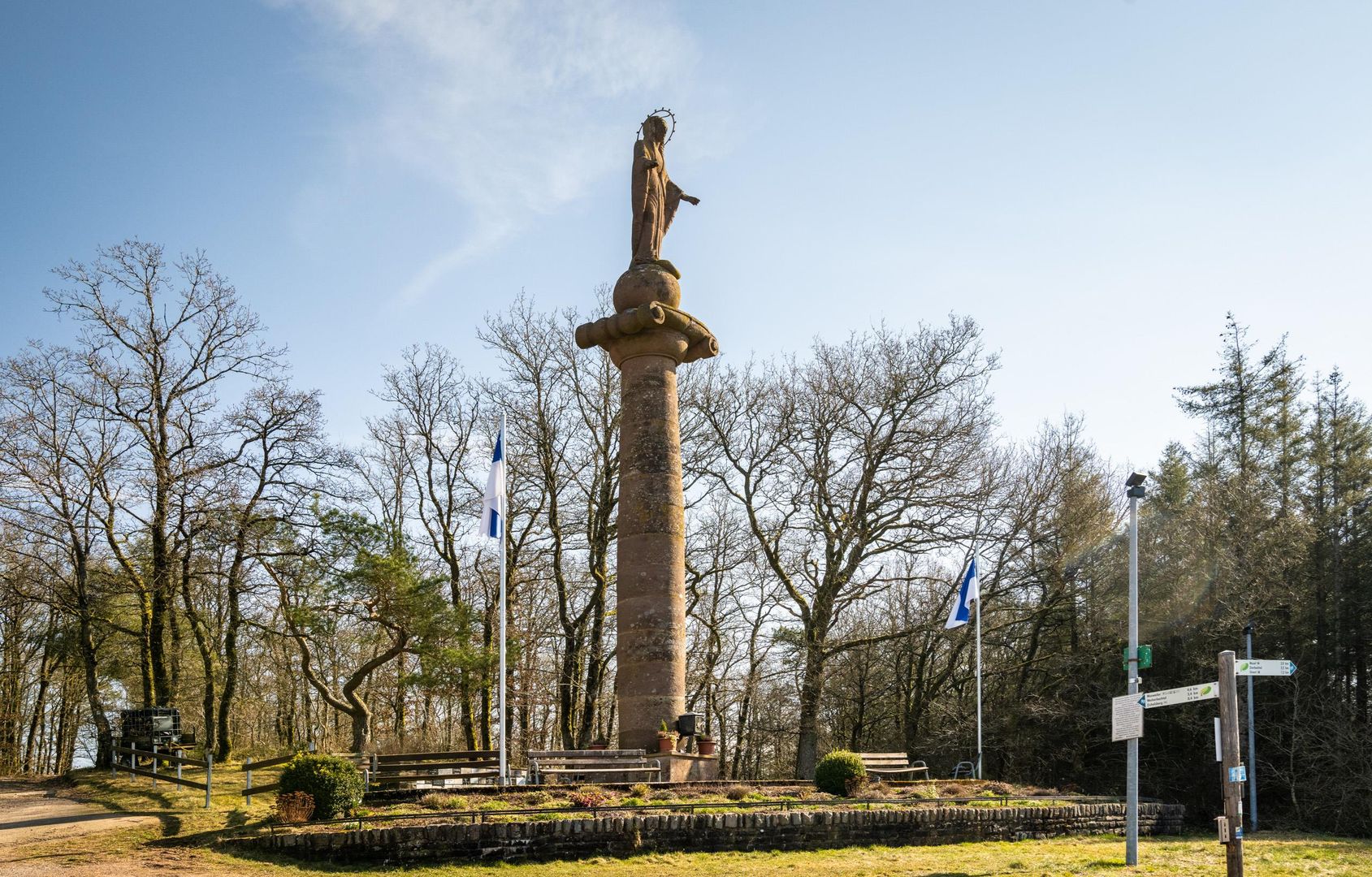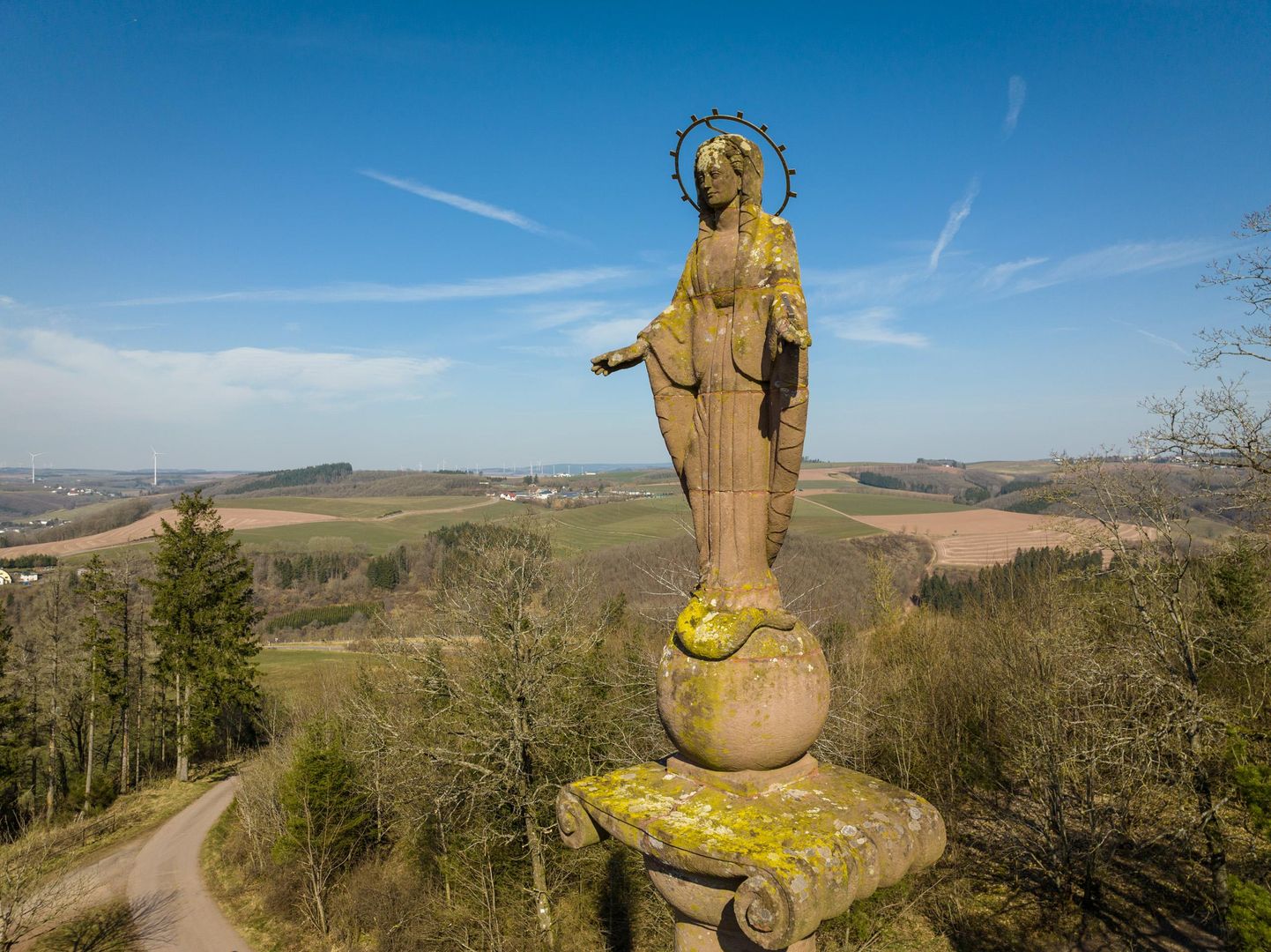 Since then, the beautiful view of the Prümtal and the surrounding heights has opened up again. The full size of the Marian column itself can be seen from the surrounding area. It towers high above the Eifel town of Waxweiler and looks far into the country. In the evening and at night it shines with a brilliant sheen. As part of the redesign, the facility was also expanded to include an altar. It stands on a brick platform made of local slate slabs. The Marian column has a total height of 16 meters. The Madonna with ball is 4.30 m high.