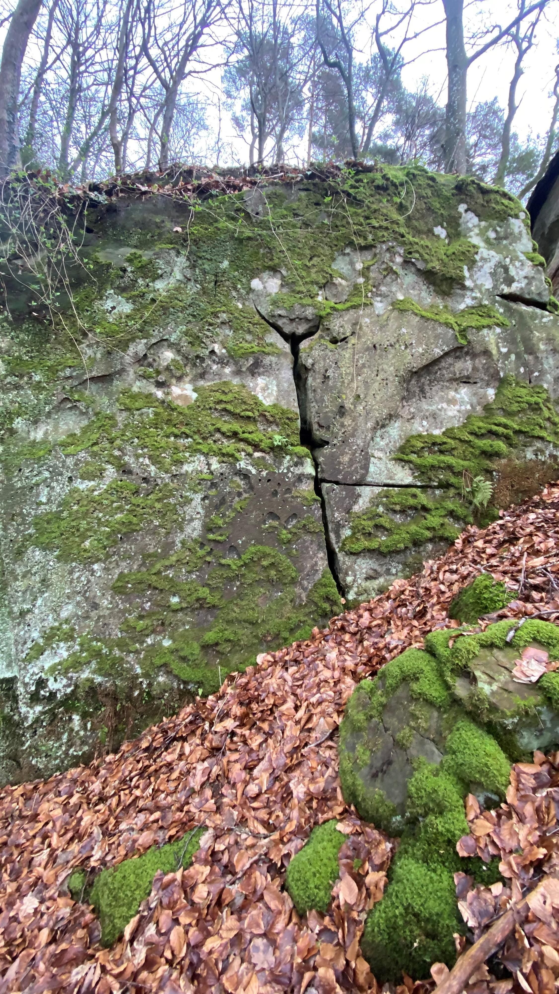 The Muhmenlay is one of the most mysterious places in the Bollendorf forest. It is said that 300 years ago, an old muhme, a herbal witch who supplied the people of Bollendorf with medicinal herbs, lived here in a rock cave. There is a narrow, high entrance to this cave in the rock. It is said that her spirit still lives here.