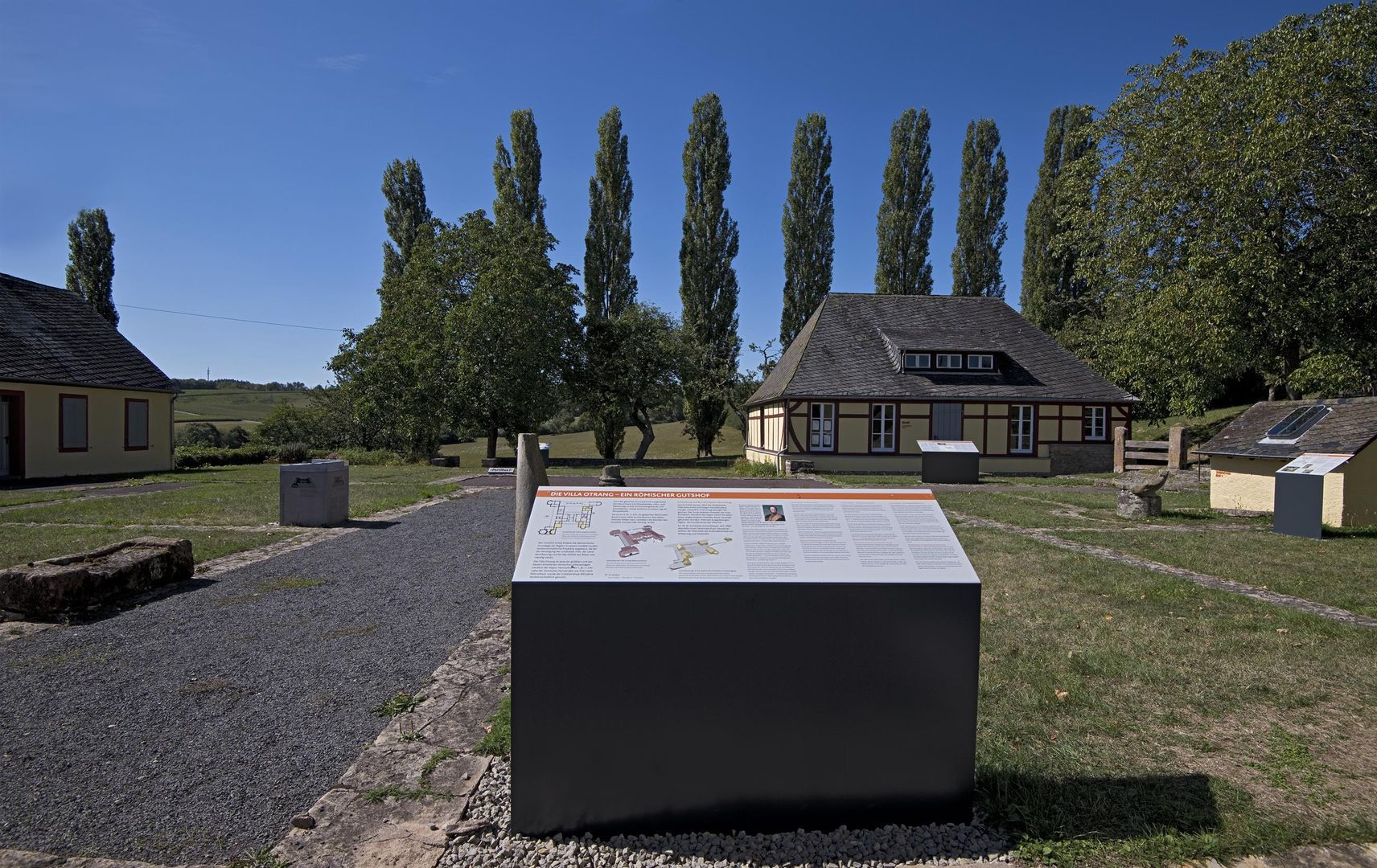 Information panels in German, English, French, and Dutch inform visitors about the Roman estate and the products that were cultivated there in Roman times.
