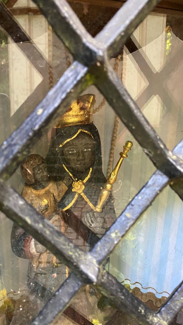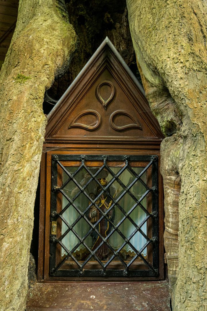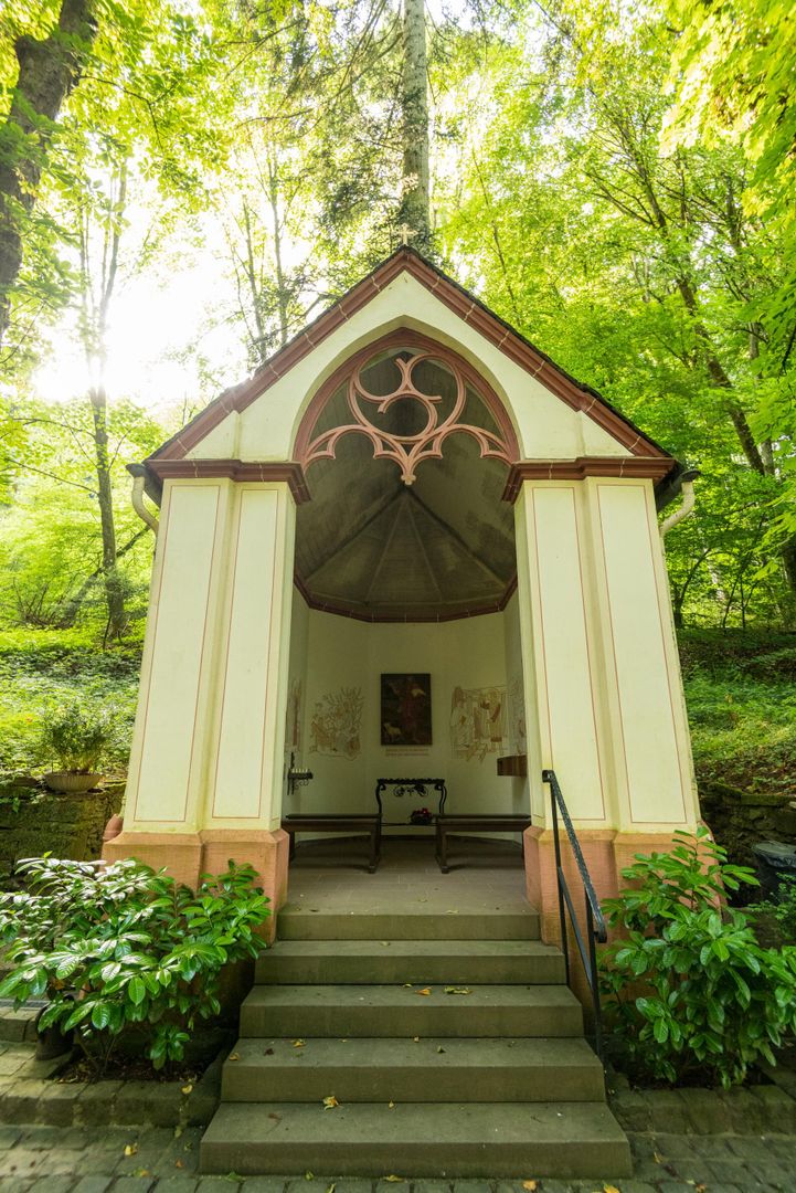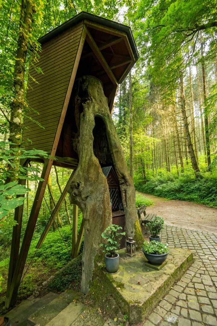 According to legend, Knight Kuno von Falkenstein sought shelter here from his rival from Vianden. St. Mary then showed him this hollow tree in which he could hide. A 46 cm tall Madonna, a replica of the 17th century Altötting Madonna, stands in a 700-year-old oak tree as a memorial. Age and candle smoke have turned the statue of the Madonna dark brown, almost black. Stations of the Seven Sorrows of Mary, created by sculptor J. Hess in the 19th century, lead to this lonely pilgrimage site.