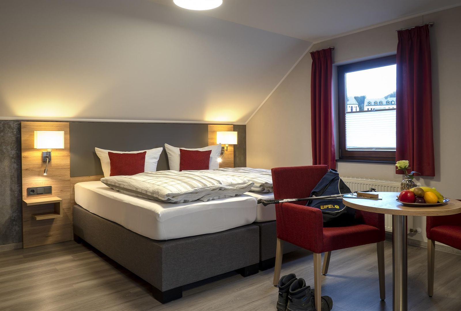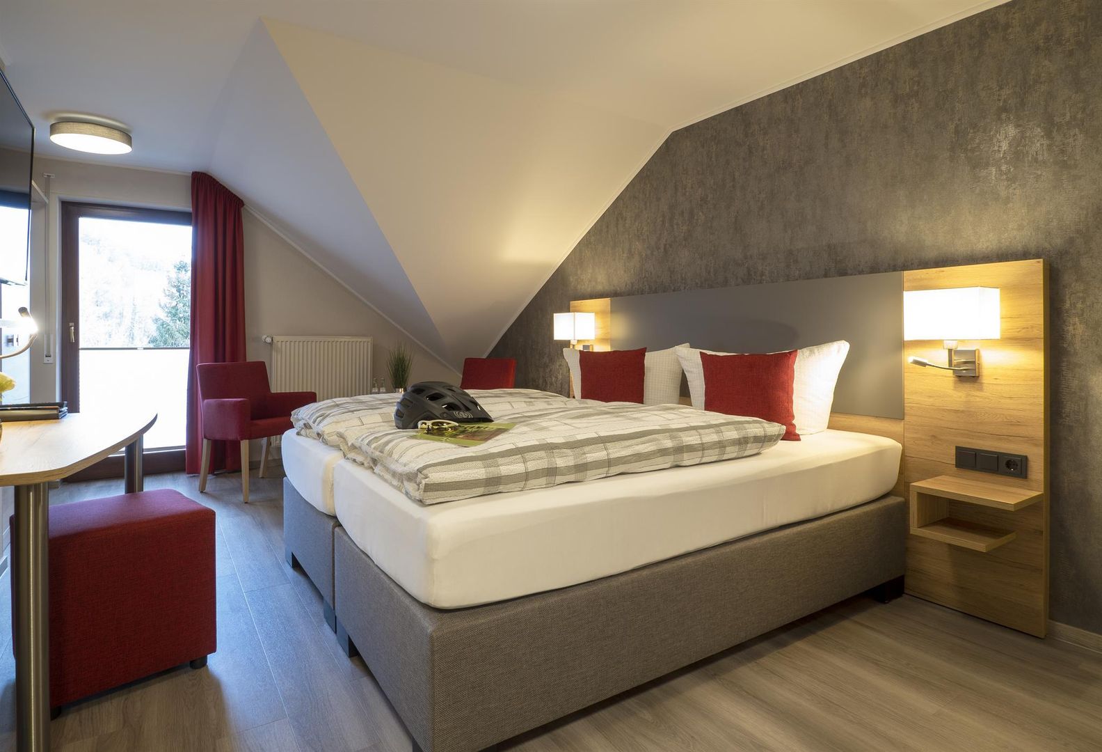 Run by our family for generations, the hotel offers comfortable rooms with shower / WC, TV, balcony or terrace. Child friendly with a play area in the restaurant and a large in-house playground with volleyball court and football goal. Rich menu with venison specialties from local forests. Vegetarian cuisine. Hiking possibilities directly from the house. Bikers and cyclists welcome. Pets are not allowed. Free garage for bikers and cyclists.