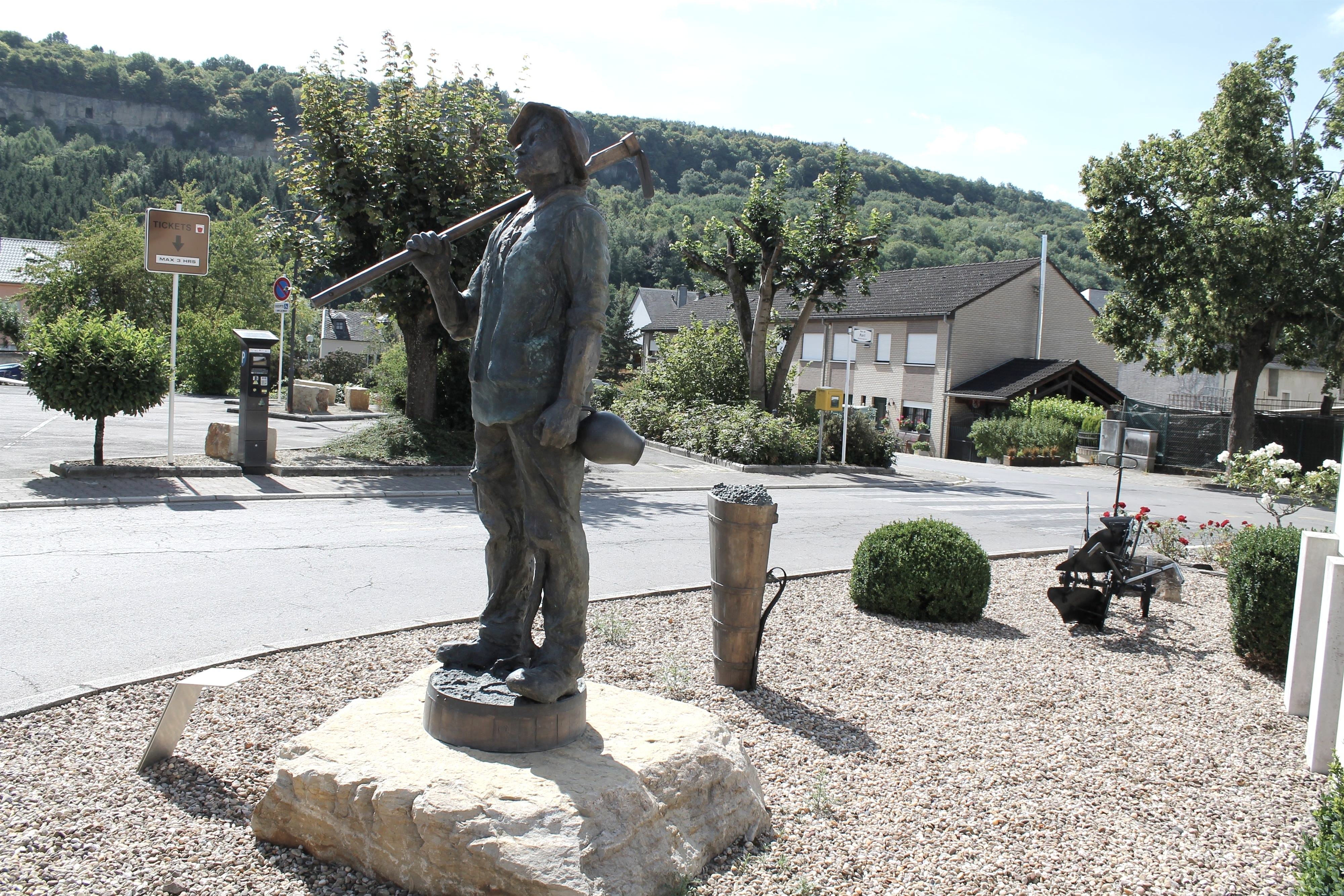 La sculpture en bronze '' De Wënzer '' représente un vigneron avec chapeau, houe et cruche.