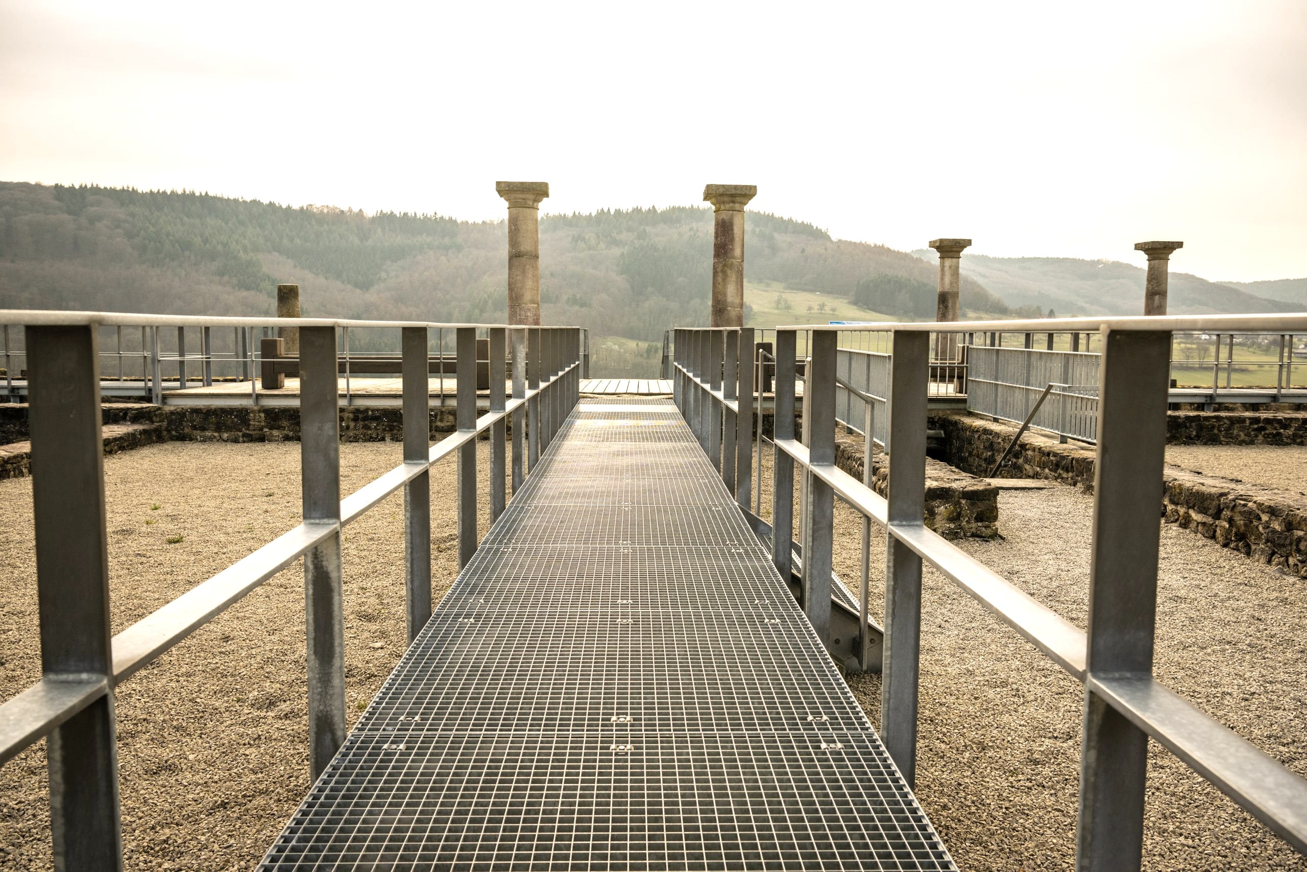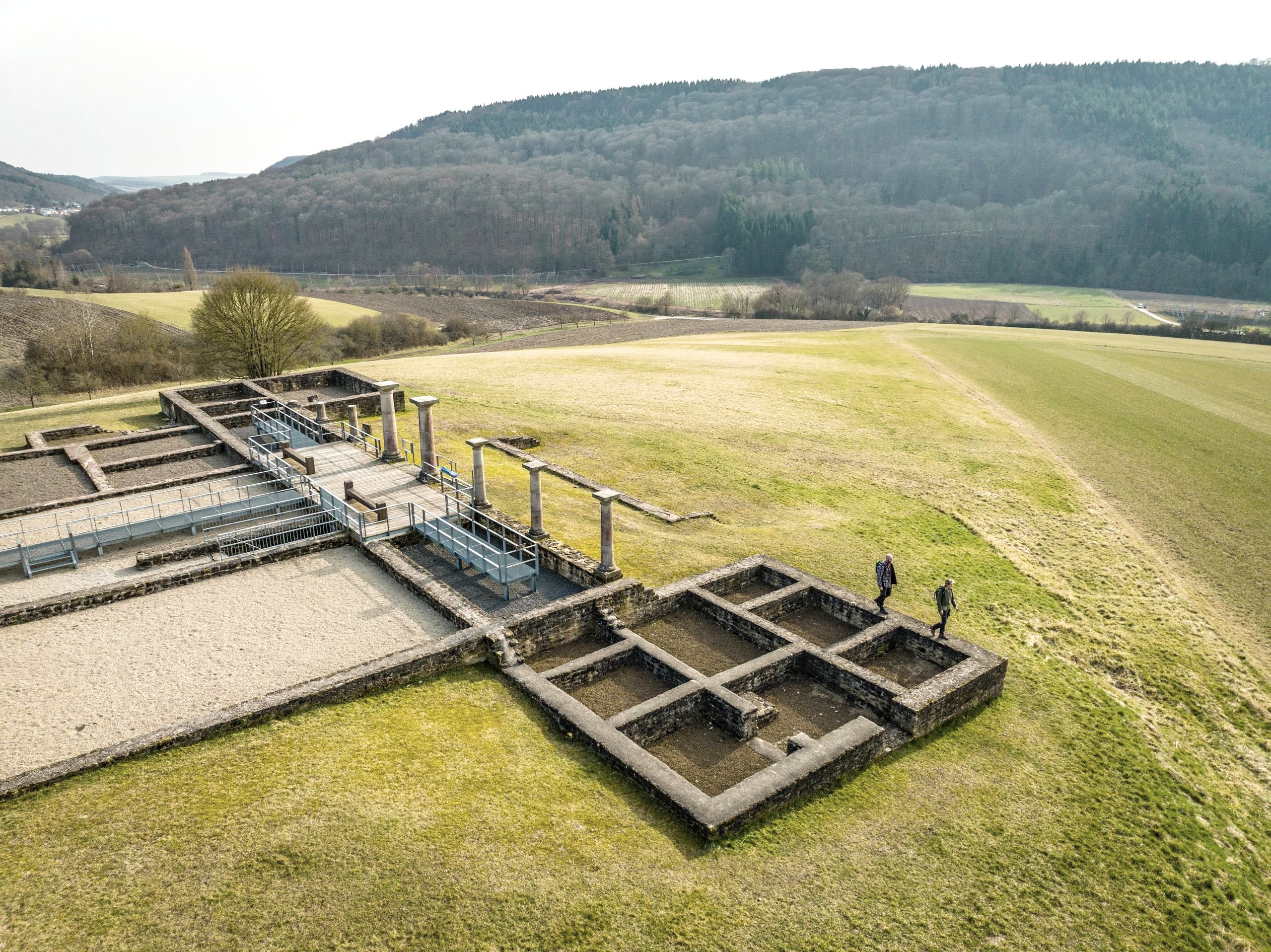 Le bâtiment principal du domaine de l'époque romaine près de Holsthum, sur le versant surplombant la Prüm, a été construit vers 100 après J.-C.. Le plan symétrique avec la salle à colonnes ouverte sur la vallée et deux tours d'angle latérales est typique de cette époque. Étonnamment, les archéologues n'ont trouvé aucune trace d'une pièce d'habitation chauffée dans les vestiges de la grande maison, et de plus, elle n'a jamais été transformée. Le grès du Luxembourg, qui affleure dans les environs, a servi de matériau de construction pour cet imposant bâtiment de plus de 47 mètres de large et de près de 24 mètres de profondeur.