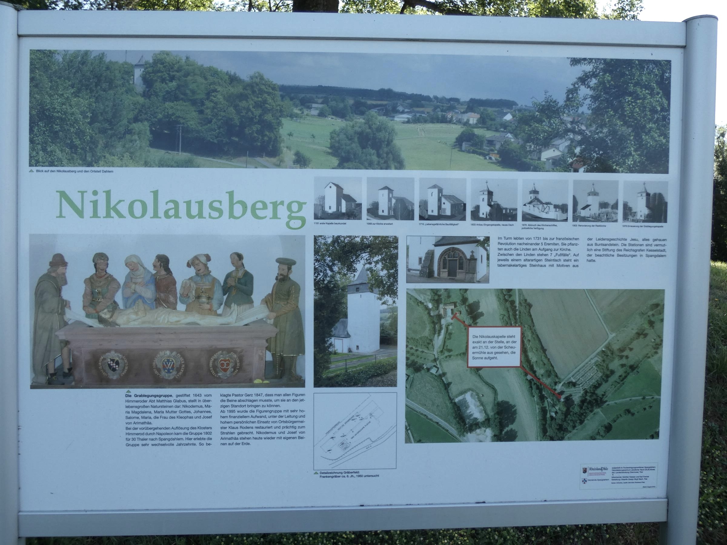 D'un point de vue culturel et historique la montagne de Nicolas est significative avec ses 7 stations de chemin de croix et la chapelle avec le réputé groupe de tombeaux. Entre les vieux tilleuls protégés et en montant vers la chapelle de Saint-Nicolas se trouvent sept «Bildstöcke» sculptures religieuses datées du 18ème siècle appelées aussi «prosternations». Les sculptures en grès rose ont la forme de petites maisons saintes. Sur le haut de la niche en forme de toît, il y a une rosace gravée qui représente avec ses cinq rayons les 5 plaies du Christ. Les sculptures ont étés renovées ainsi on peut les reconnaître à chaque station. Elles montrent: I. La scène de l'huile sur la montagne sainte. II. Jésus portant la croix. III. Jésus chute pour la première fois avec la croix. IV. Jésus chute pour la seconde fois avec la croix. V. la crucifixion. VI. Jésus sur la croix.VII. La mort et la délivrance de Jésus. Quelques pas plus loin se trouve la chapelle Saint-Nicolas dont la tour romane avec le cadran solaire est encore un vestige de l'ancienne église Saint-Nicolas du 12 ème siècle. Dans la chapelle se trouve un groupe de trois sculptures, le groupe de tombeaux de l'année 1643, aussi le groupe des pleureuses appelé «tombeau sacré» et le groupe qui est de 1750 appelé «groupe de la résurrection».