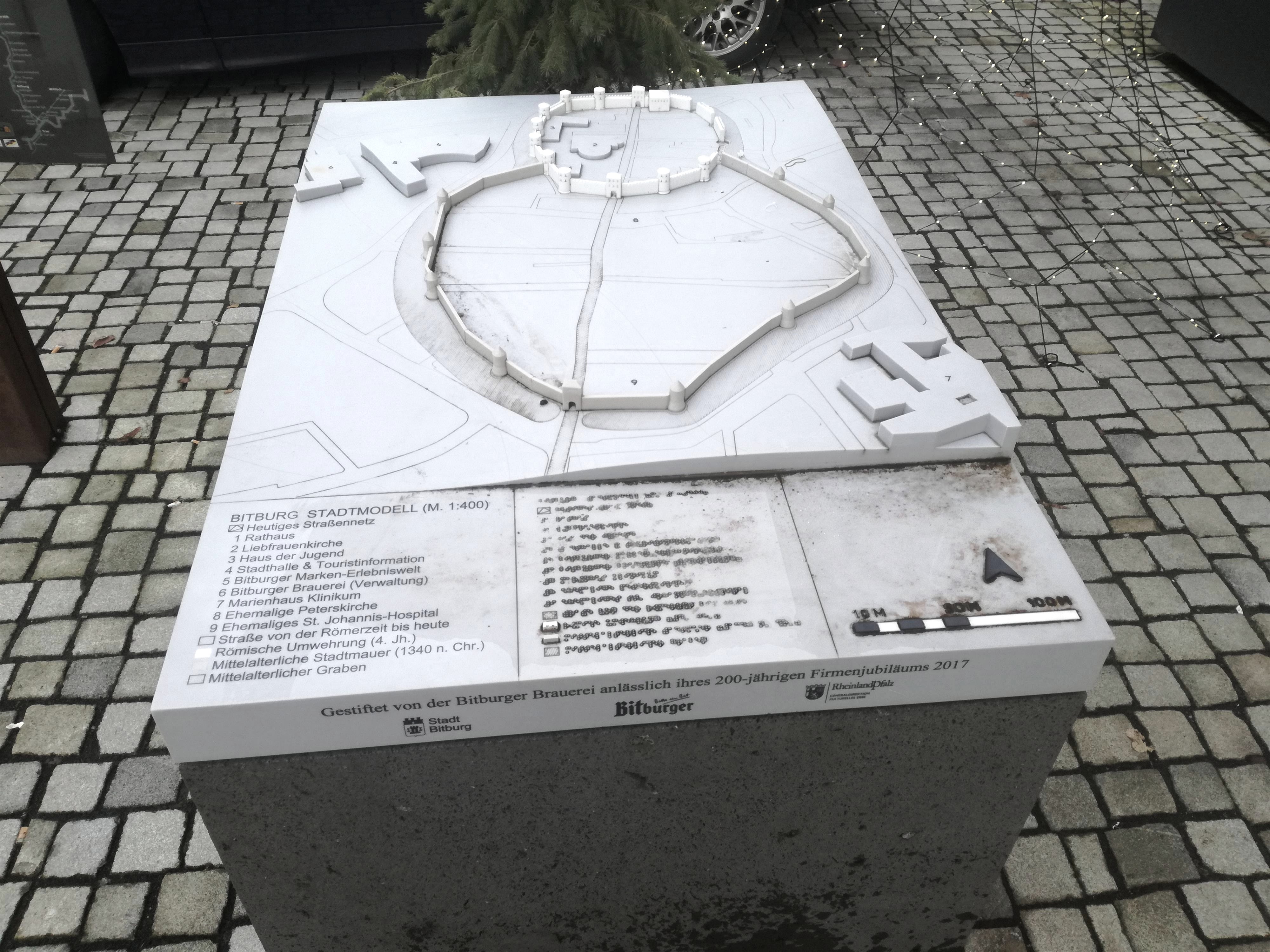 La maquette en Corian montre les différents stades de développement de la ville, du village-rue romain à la ville médiévale en passant par les fortifications de la fin de l'époque romaine. Elle se trouve dans la zone piétonne, à proximité immédiate de l'église Liebfrauen.