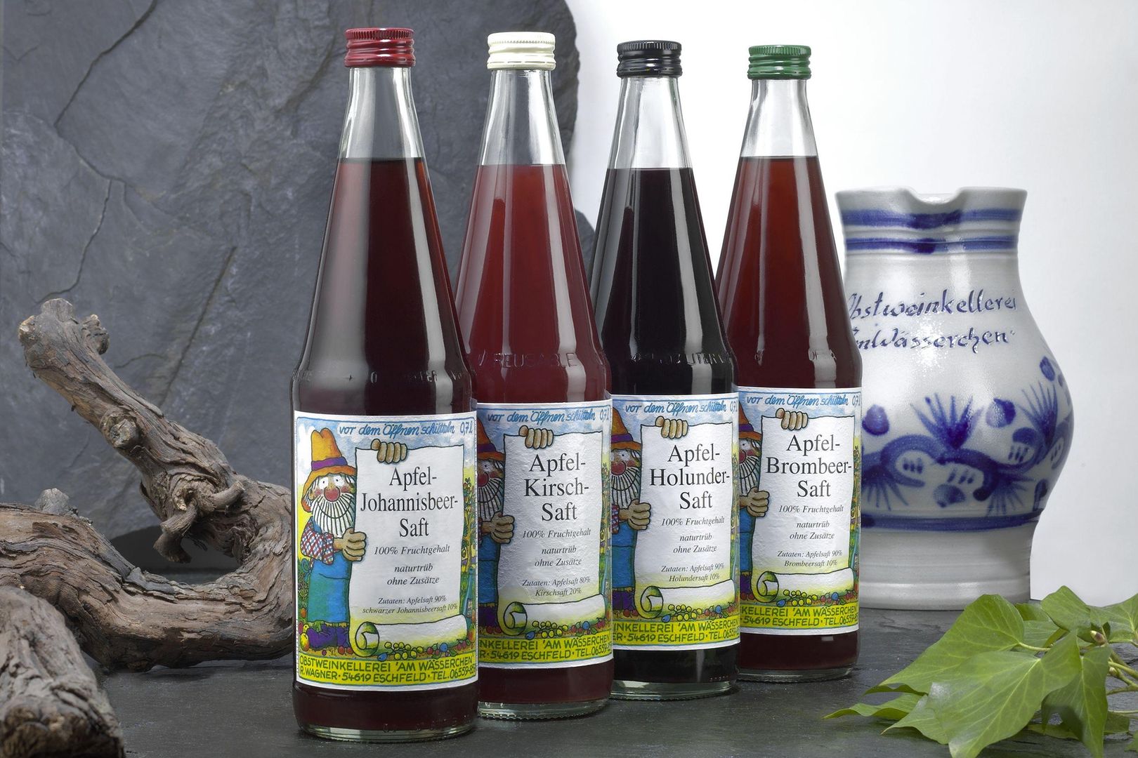 La gamme s'étend du vin de rhubarbe méconnu au traditionnel hydromel ou aux jus de fruits sans alcool. Tous les jus contiennent 100 % de fruits, sans ajout de sucre, sans conservateurs et sont trouble naturel. Ils sont embouteillés à la fraîcheur de la récolte et ne sont pas stockés sous forme de concentré.
