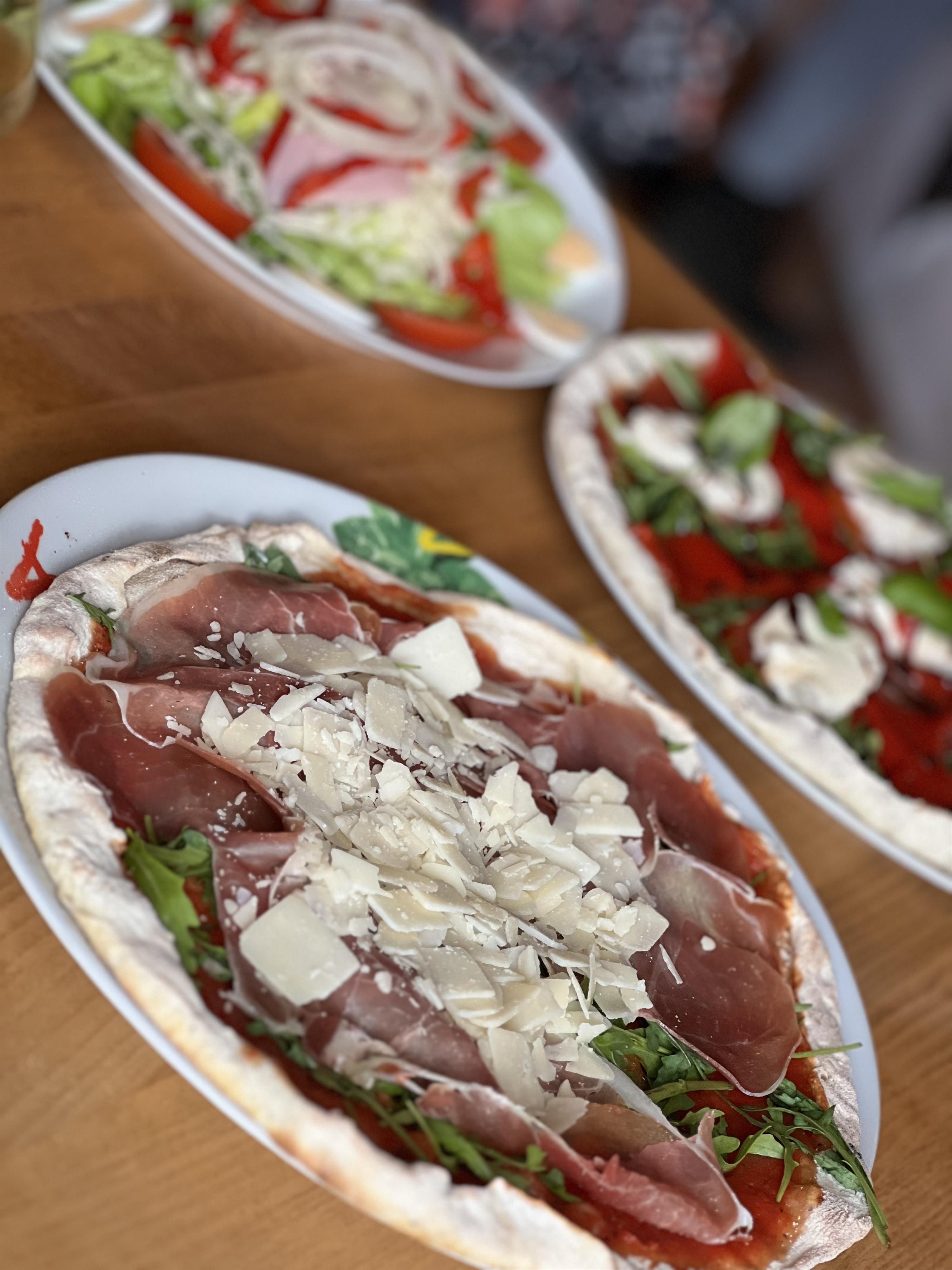 Pizza au four à bois, différentes variations de salades, spécialités de pâtes