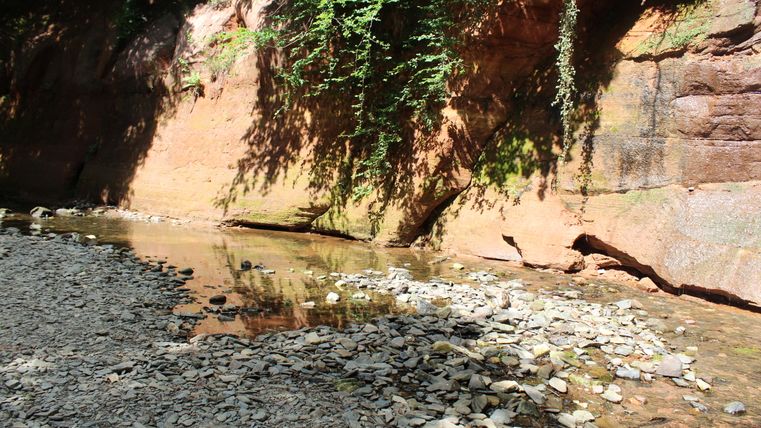 Après avoir repris des forces, nous ne sommes plus très loin de notre point de départ à Mettendorf. Mais nous tombons maintenant sur le point culminant du paysage de la randonnée - le "Roter Puhl". Ici, l'Enz a creusé dans le grès bigarré de l'ère géologique du Trias, qui se présente de manière impressionnante dans des couleurs orange-rouge vives. Les dépôts dans les zones fluviales et deltaïques datent d'environ 220 millions d'années.