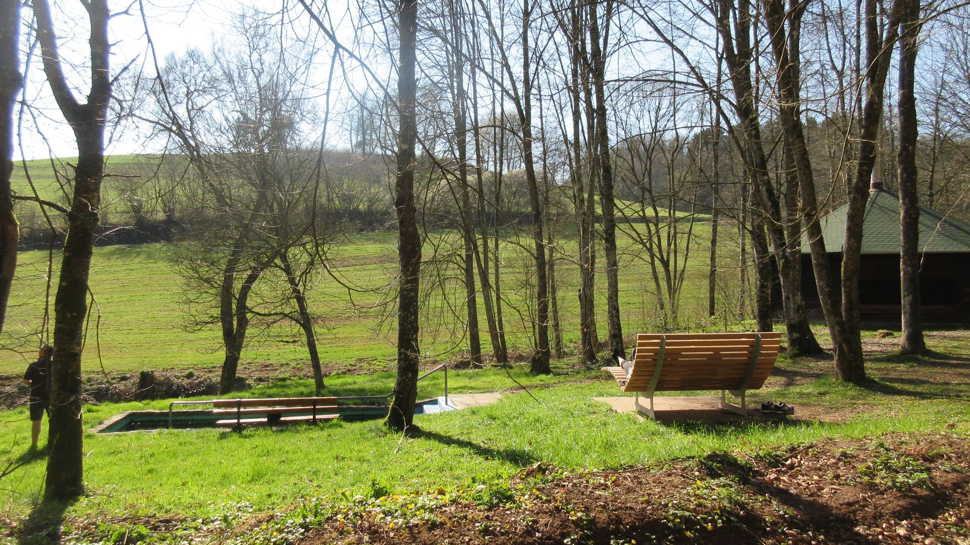 Nous traversons une zone tranquille en périphérie du village et nous approchons de la vallée d'Alsbach, un coin de nature vraiment idyllique. Relativement au début de la vallée, nous trouvons une première station de repos et de rafraîchissement - le bassin de marche aquatique près de la cabane de barbecue. De confortables chaises longues en bois nous invitent à reprendre notre souffle.