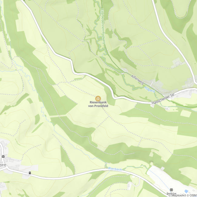 Vous pouvez atteindre ce banc XXL à pied en empruntant le chemin Albachhöhenweg qui passe juste à côté. En venant de Pronsfeld sur la L16 en direction de Habscheid, un chemin rural se trouve à gauche juste après le village. Suivez-le sur environ 200 m jusqu'à la croisée, puis tournez à gauche. De là, le banc géant est à seulement 350 m.