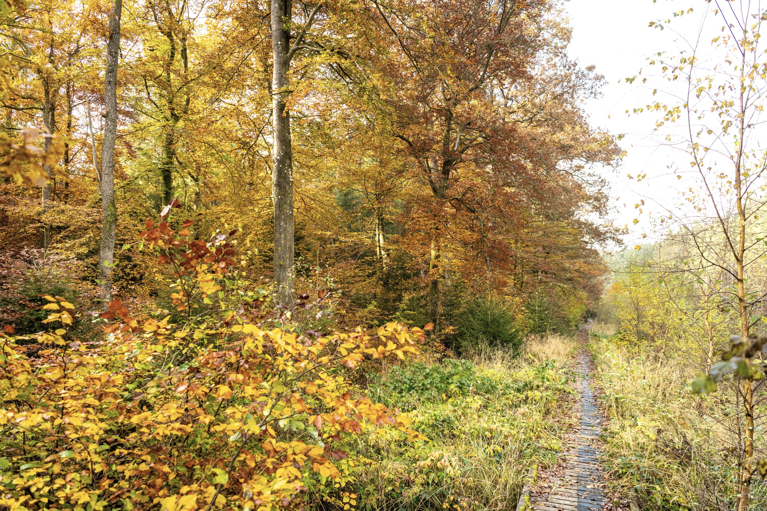 Le sentier de randonnée vous emmène sur des chemins sinueux au cœur de la plus haute forêt du parc naturel de l'Eifel du Nord. Elle est enchanteresse et mystique. Des tapis de mousse verts et doux drapent le sol de la forêt, parsemé de buissons de bleuets et d'airelles. Des rayons de soleil isolés traversent les épais branchages et dessinent des motifs dans les tons jaune-orange sur l'écorce des arbres. En de nombreux endroits, vous découvrez des ruines de bunkers envahies par la végétation qui, en y regardant de plus près, se détachent de la pénombre de la forêt. Il s'agit de vestiges du Westwall, construits à une époque sombre où la crête de la Schneifel était encore dénudée.