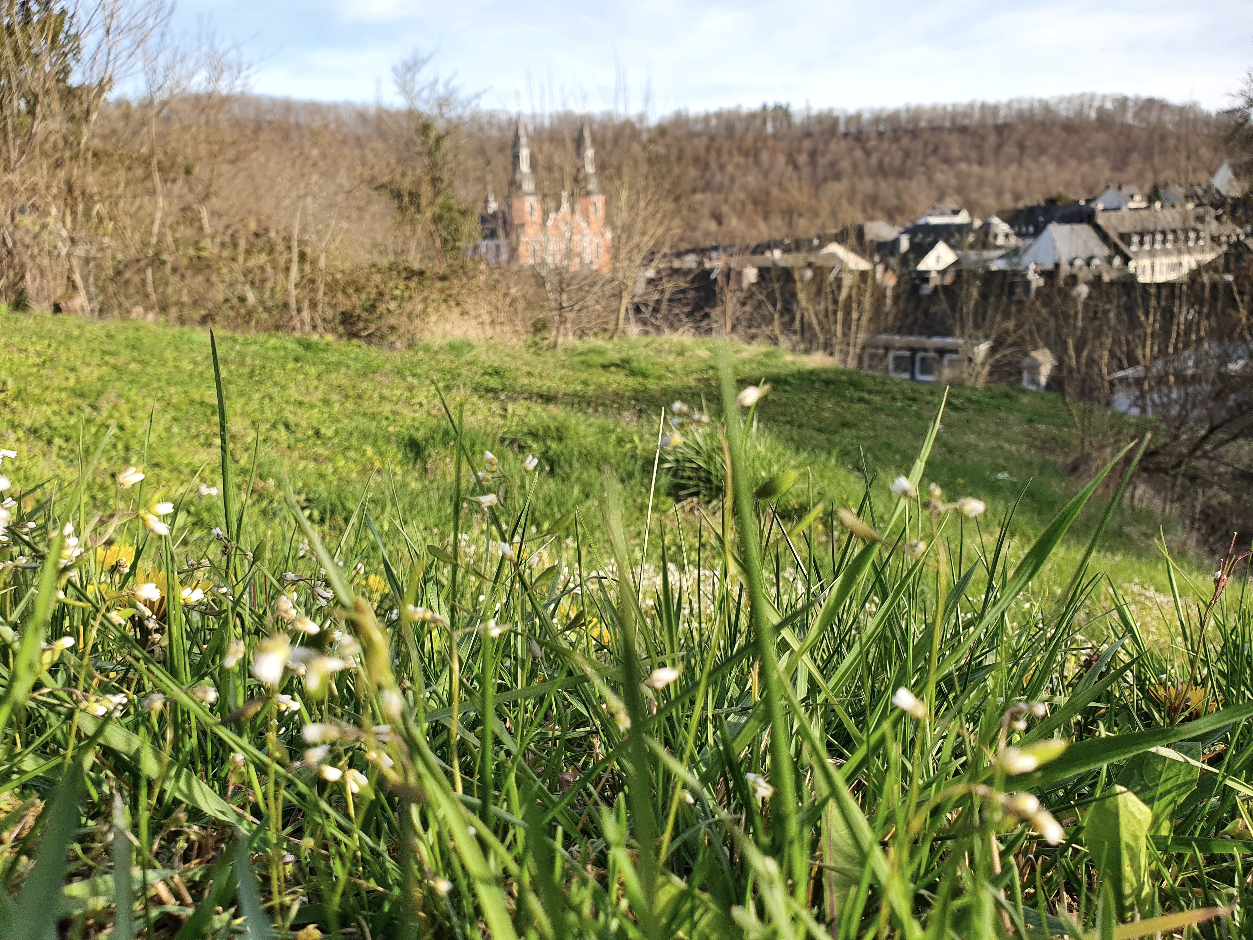 Une vue très particulière sur la basilique Saint-Sauveur s'offre au Kalvarienberg avec la croix en basalte qui se trouve au bord d'un énorme entonnoir d'explosion. L'explosion d'un ancien bunker du Westwall rempli d'explosifs le 15 juillet 1949 a de nouveau gravement détruit la ville peu après la fin de la guerre.