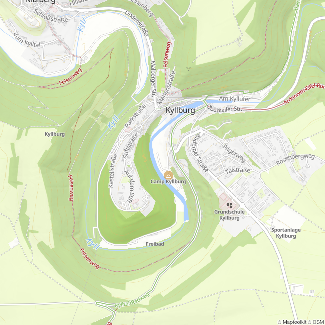 Inmitten der grünen Natur liegt Camp Kyllburg. Camp Kyllburg ist ein Familiencampingplatz und befindet sich auf beiden Seiten des Flusses Kyll. Mittels einer Fußgängerbrücken sind die beiden Seiten mit einander verbunden.