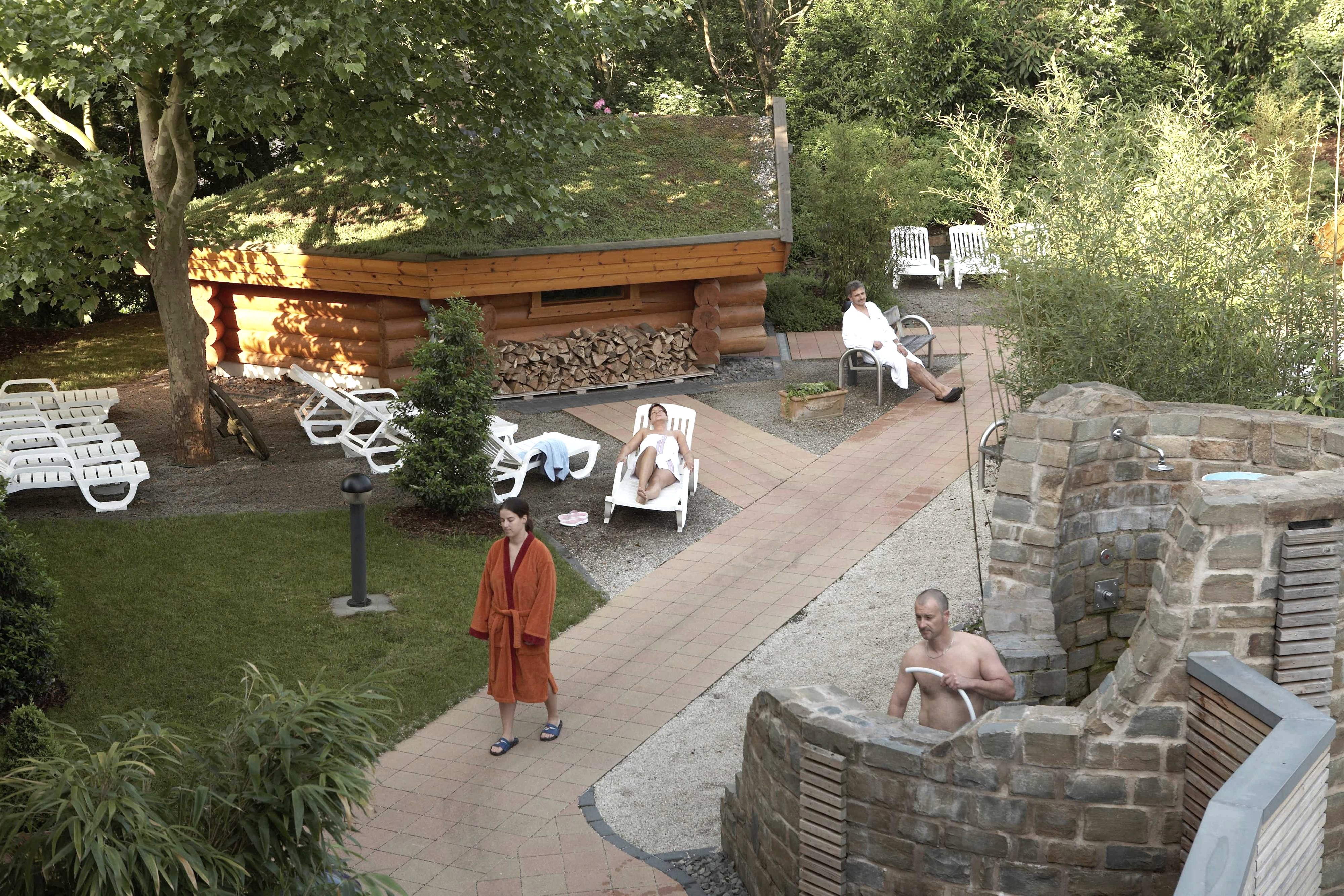 Gezondheit & welbehagen beleeft U in de 4-sterren saunawereld met 2 Romeinse sauna´s, een Turks-Osmaans stoombad en 3 Finse sauna´s met verschillende temperaturen (75°C, 85°C edelsteensauna, 95°C). De tuin met aardsauna (110°-120°C) en vuursauna (100°C) voldoen aan de hoogste eisen. Voor de afkoelings- en rustphases staan de saunabezoekers douches met diverse geurstoffen, koudwaterbassins in de in- en outdoor-sector en tevens warmwaterbad en relaxzone ter beschikking. Bovendien bestaat de mogelijkheid van het veelvoudige massage-aanbod of een bezoek aan het solarium te genieten.