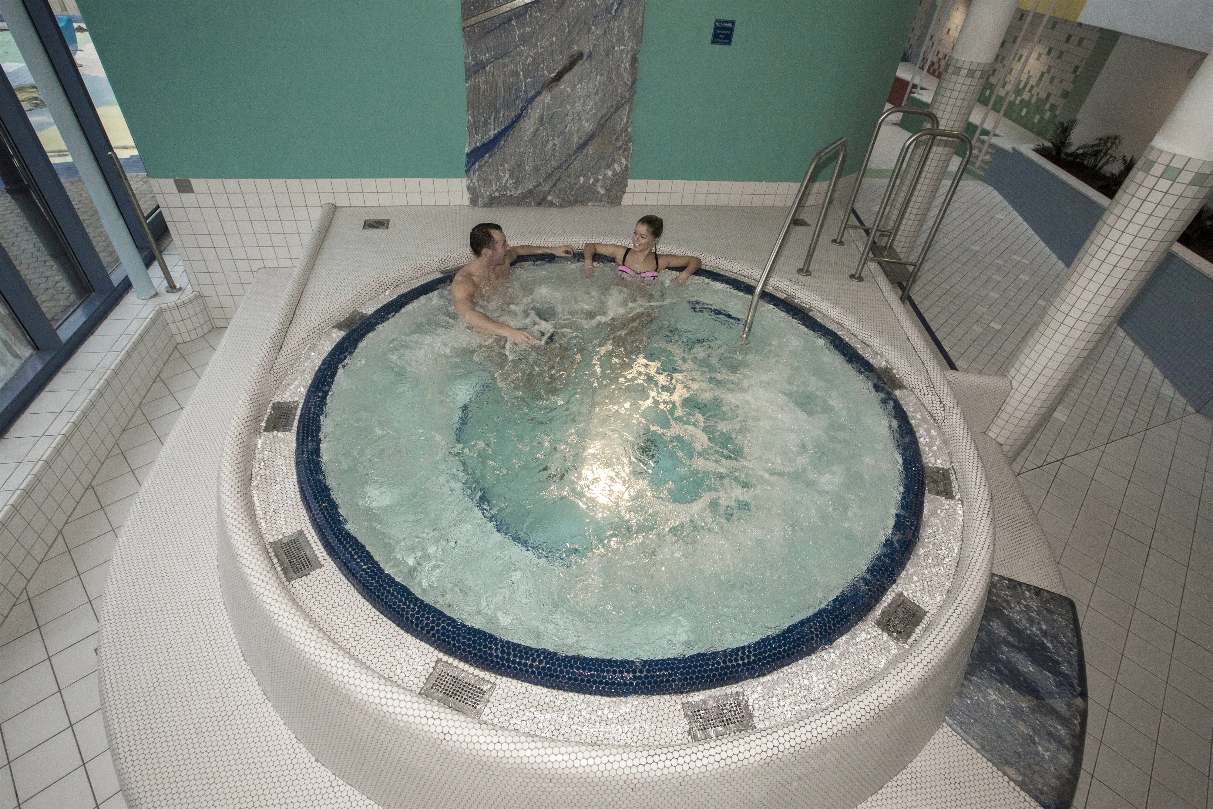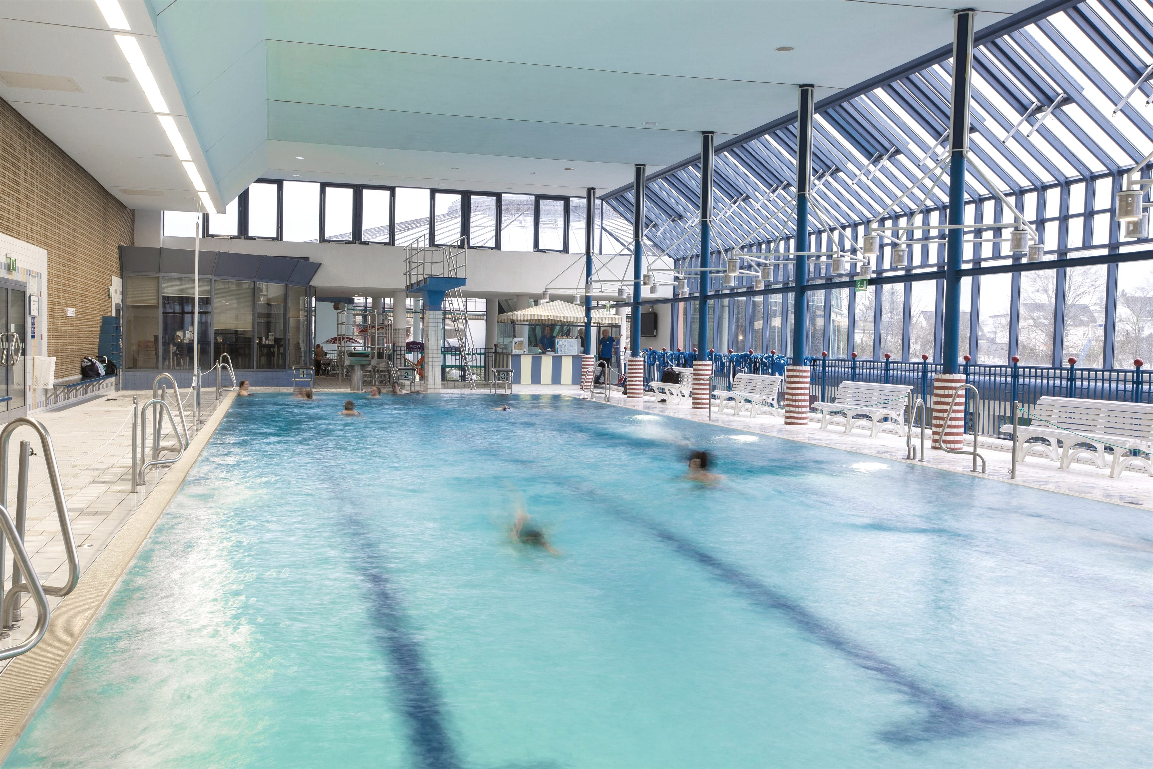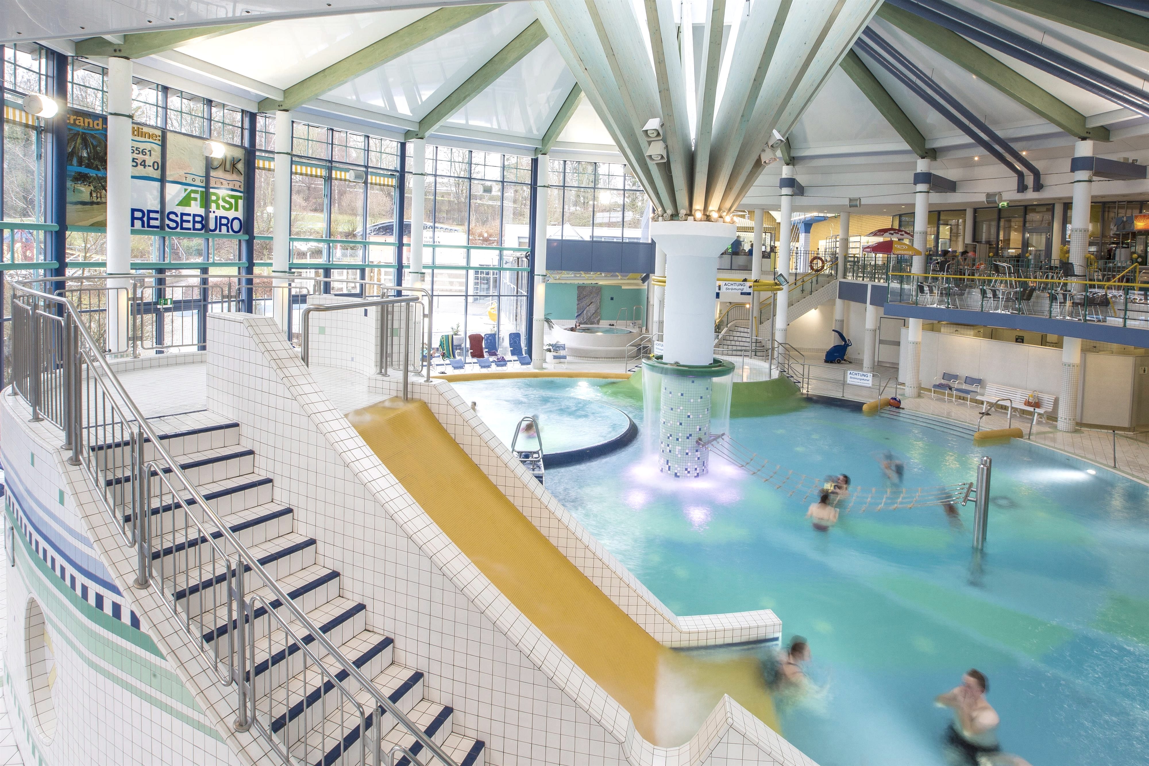 Ongeacht winter of zomer, in het recreatiebad CASCADE met SAUNAWERELD spelen de weersomstandigheden en het jaargetijde geen enkele rol. Hier kunt U gedurende het hele jaar naar keuze volledig ontspannen, of een dag vol actie en plezier beleven. Spanning & actie in het recreatiebassin met stromingskanaal, watervallen en waterkanonnen, brede stijle glijbaan, klimnetten en enorme zwembanden. De 55 m lange "Black-Hole-Slide" (pijp)-glijbaan is een absoluut plezier. Recreatie & plezier in het peuterbad, een vermakelijke waterspeelplaats met glijbanen, fonteinen en allerlei speelgoed. Rust & ontpanning vindt U in het warme bruisbad en in het bassin met weldadige massagesproeiers. Activiteit & fitnessin het 25 m lange sportbassin met 3- en 1 m hoge springtoren, in het 6-baans openlucht-sportbassin met 1-, 3-, und 5 m springtoren. In de openlucht-sector bevindt zich bovendien een ondiep bassin met 4 m brede glijbaan en een groot recreatiebad. Een zandbak en tafeltennis ronden de zwembadbelevenis af. Cursussen watergymnastiek en wateraerobic houden de bezoekers fit.