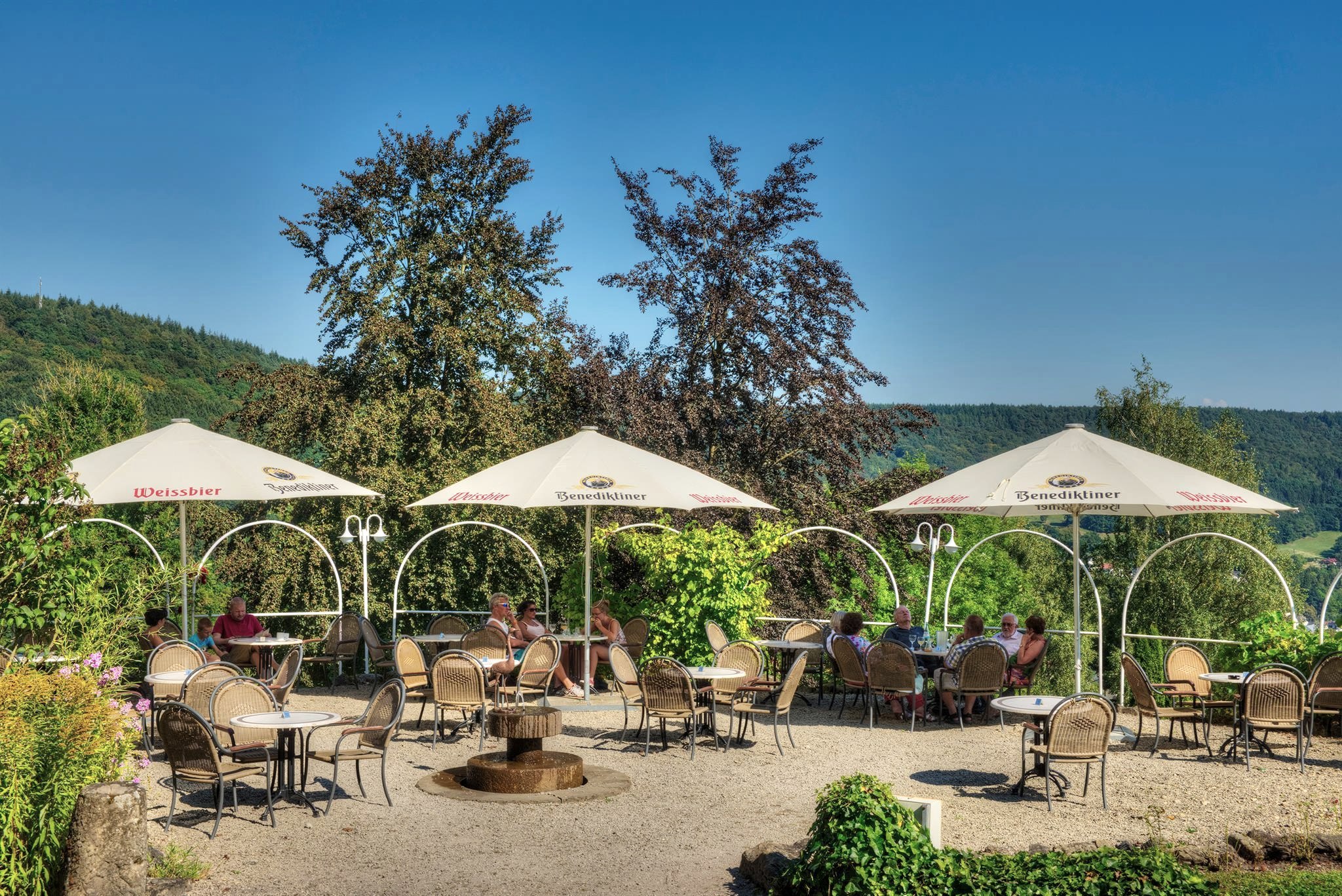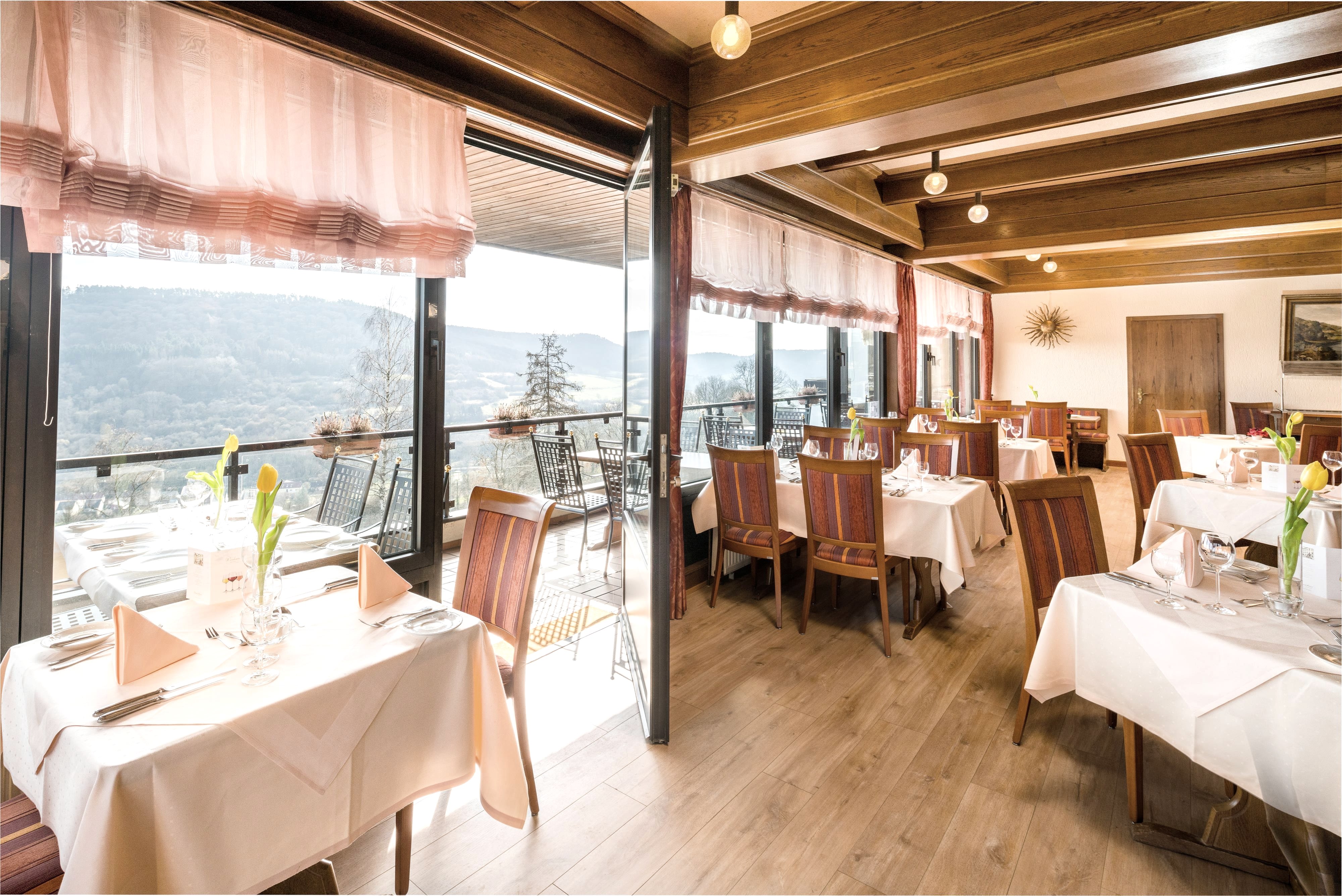 Beste Eifel-keuken uit eigen productie, met inbegrip an originele Eifelappelbrandewijn-amandel-rozijnen-taart, appelsap uit onze eigen appels. Restaurant Bellevue met internationale en regionale keuken, uitgelezen wijnen, grote buitenterras, ligweide, bouleplaats en rosen-terras.
