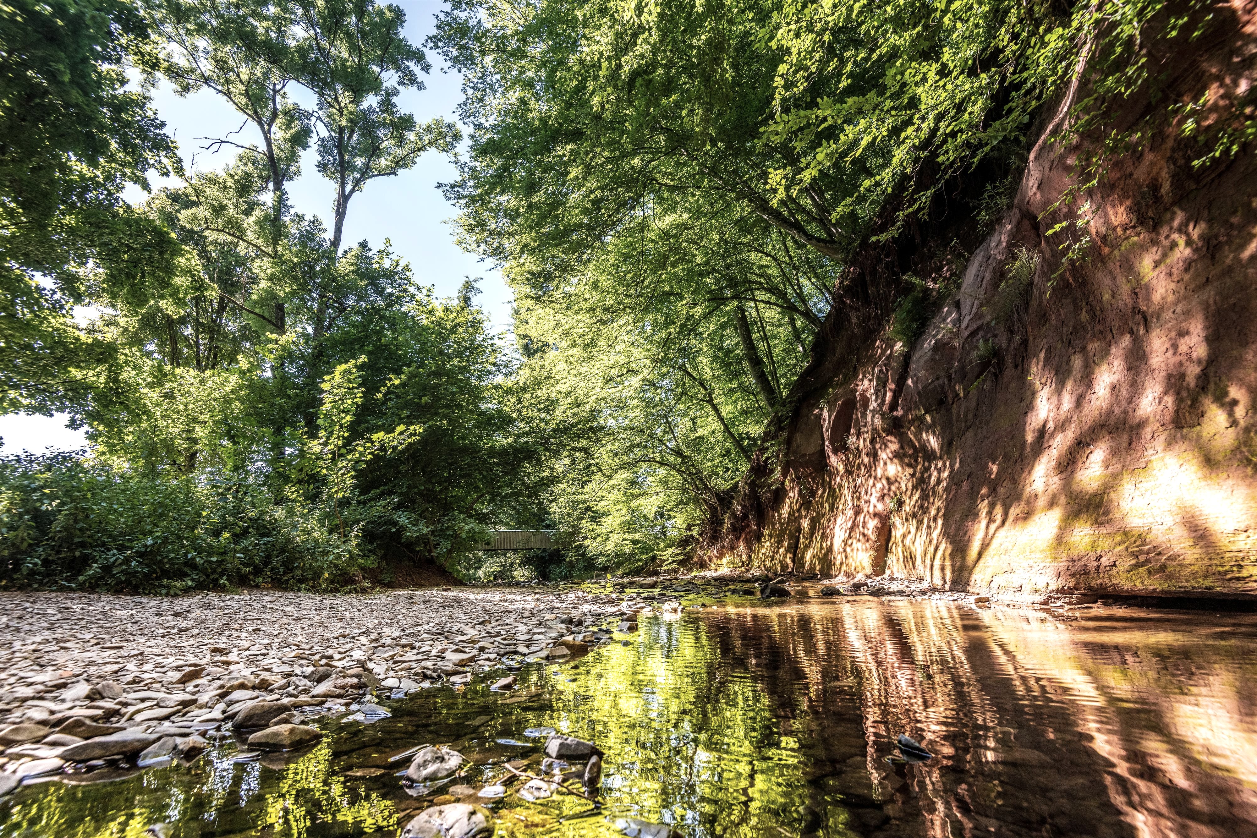 Bij de "Rote Puhl" heeft de Enz de met beuken begroeide helling op indrukwekkende hoogte ingesneden. Hier vallen de rotsen van het middelste rode zandsteen uit het Trias op in felle oranjerode kleuren. Deze afzettingen in rivier- en deltagebieden zijn ongeveer 220 miljoen jaar oud.