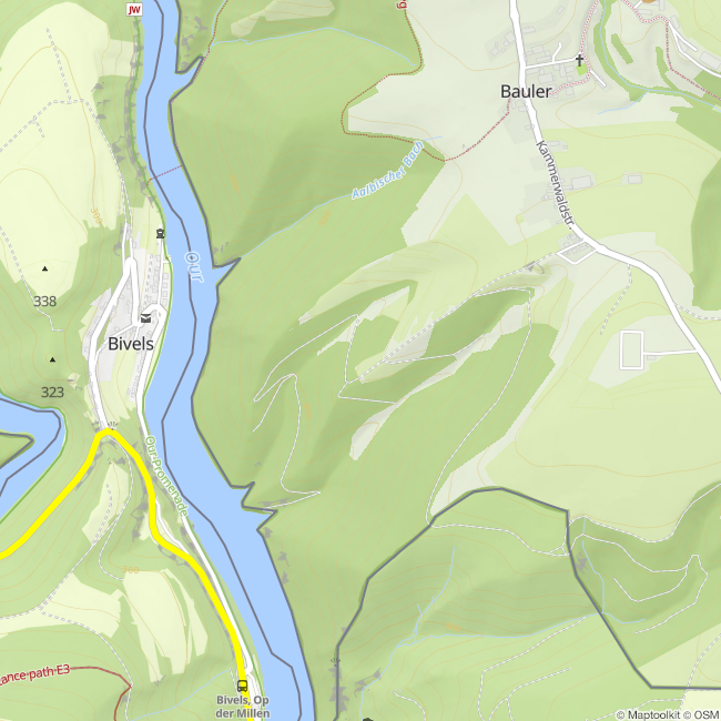 De ruïnes van kasteel Falkenstein verheffen zich op een steile bergrug hoog boven de Ourvallei. Onder het kasteel kronkelt de Our in een opvallende bocht en vormt zo de grens met het Groothertogdom Luxemburg.