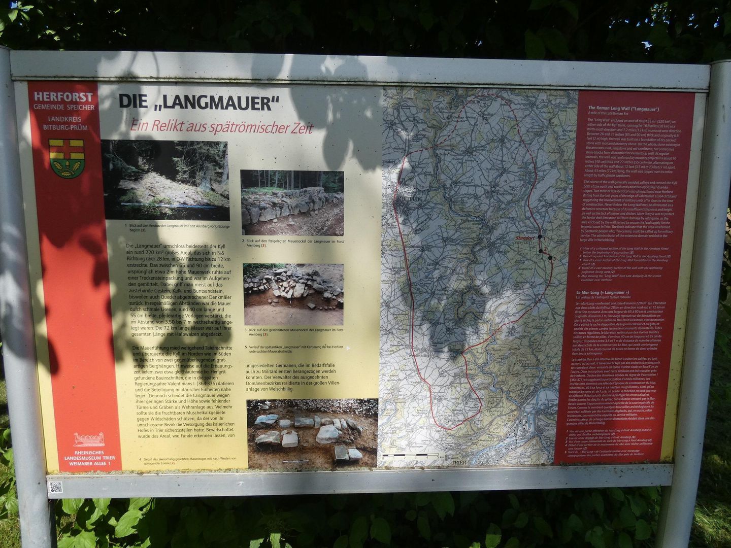 Tijdens de Romeinse bezetting in de periode 350 n. Chr. ontstonden de z.g. Latifundenbedrijven, d.w.z. de bewerking van samengevoegde stukken land. Destijds werden o.a. delen van de gemeenten Orenhofen, Speicher, Herforst en Spangdahlem (het westelijke deel van het district Speicher) samengevoegd. De z.g. "Langmauer" (lange muur) vormde de grens van een 220km2 groot gebied van Trier tot Kyllburgweiler. In het gemeentelijke "Arenbergischen Forst" (bos van Herforst) zijn nog 1 meter hoge originele restanten van deze muur behouden gebleven. Volgens de huidige wetenschap bestond dit Romeinse monument uit inheems zandsteen, had een totale lengte van ca. 72 km, een hoogte van 2-3 m, een breedte van 70-80 cm en was afgewerkt met halfronde stenen. Aan de rand van het dorp Herforst kan een reconstructie van deze muur bezichtigd worden. Bouw, ligging en richting zijn overeenkomstig met het origineel. Tevens heeft men in deze reconstructie nabootsingen van bij opgravingen ontdekte z.g. PEDATURA-stenen met Romeinse inscripties verwerkt.