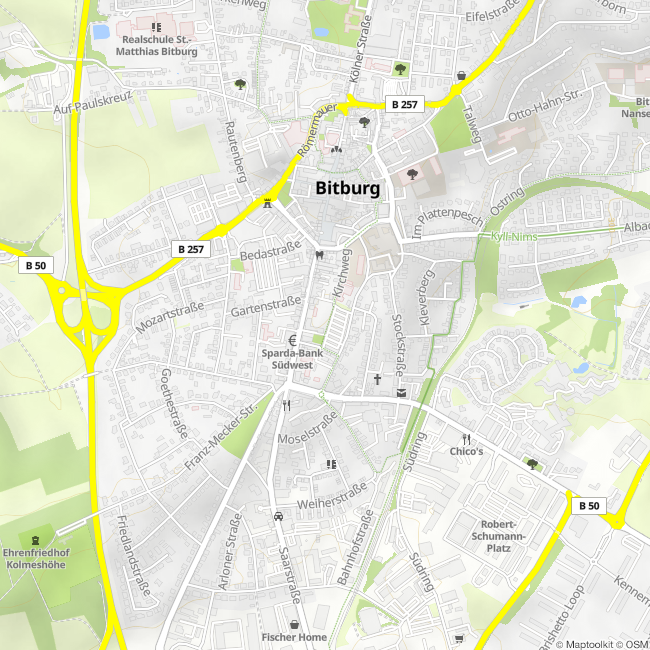 gymnasium". Het stadscentrum, het stadhuis en het VVV-kantoor liggen op