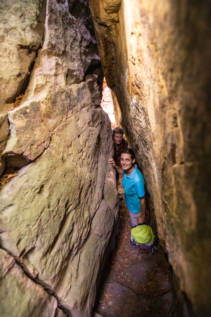 Dan klim je weer omhoog en bereik je een ander hoogtepunt in het rotsachtige landschap: de "Mandrack"-doorgang. Deze is slechts ongeveer 40 cm breed aan de schouder. Het is goed om een partner aan je zijde te hebben om je rugzak mee te nemen.