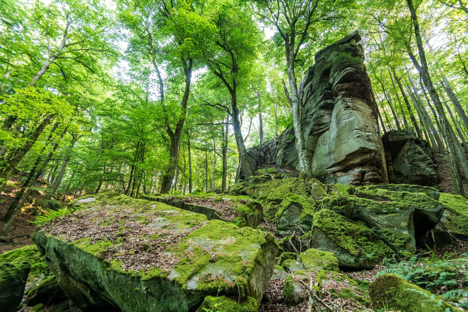 Je begint op de Sonnenberg boven de vakantie- en grensplaats Bollendorf, wint snel hoogte en omcirkelt het Bollendorfplateau aan de spectaculaire zuidrand. Ruige rotsformaties torenen boven je hoofden uit: Nikolauslay, Muhmenlay en Predigtstuhl, omgeven door het kronkelende pad dat je volgt over in steen uitgehouwen treden. Het is alsof de duivel de hand had in het samenstellen van deze gigantische rotsblokken: enorme blokken steen, kunstig gestapeld en goed in balans - ingebed in het weelderige groen van varens, korstmossen en mossen.