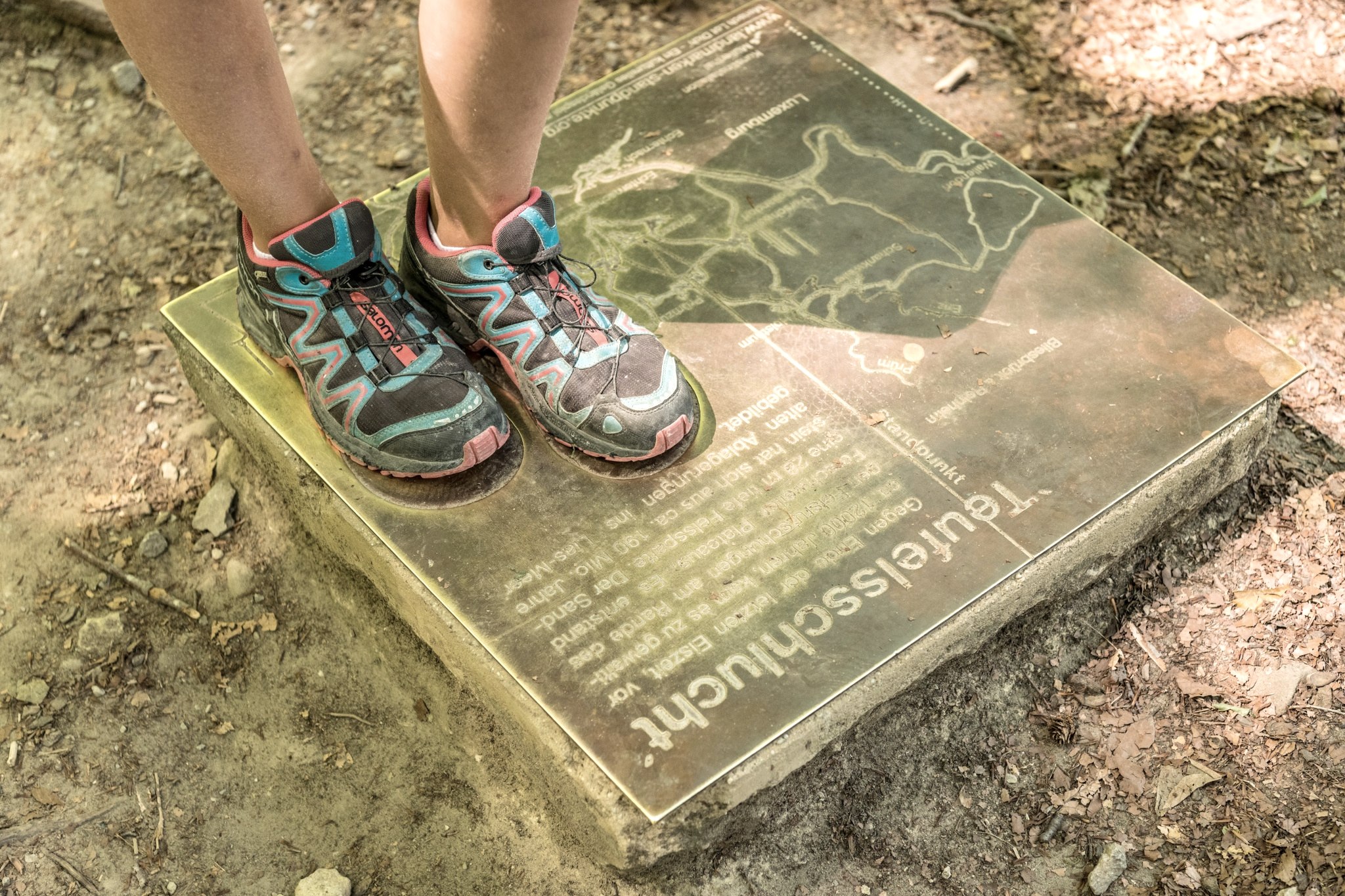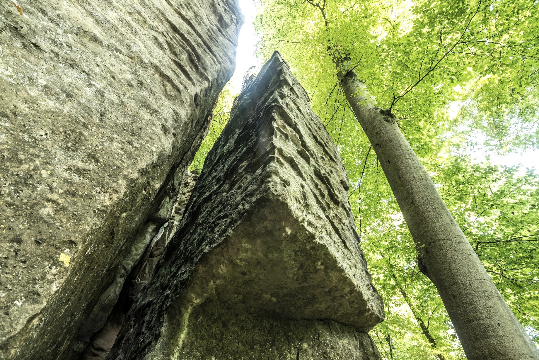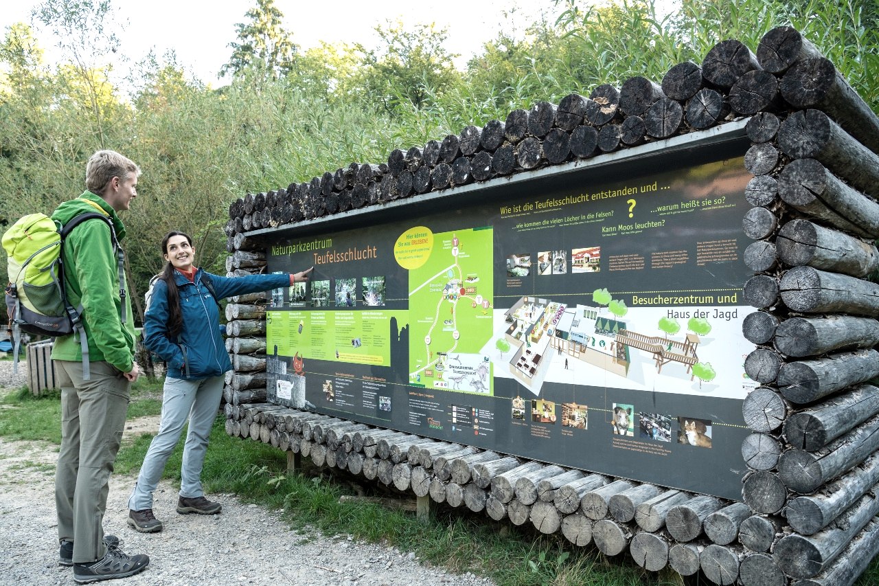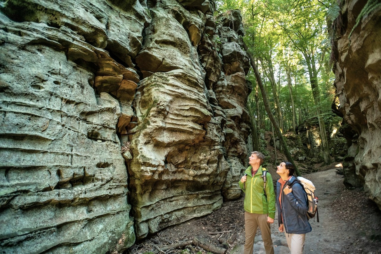 Het begin- en eindpunt van deze rotsachtige tocht, die ook geschikt is voor oudere kinderen, is het natuurparkcentrum Teufelsschlucht. Volg de markeringen - een witte "T" van de duivel op een rode achtergrond - en je komt al snel bij de Duivelskloof: een oog van een naald in het zandsteen dat zijn naam verdient en de ingang tot een fascinerende wereld van rotsen.