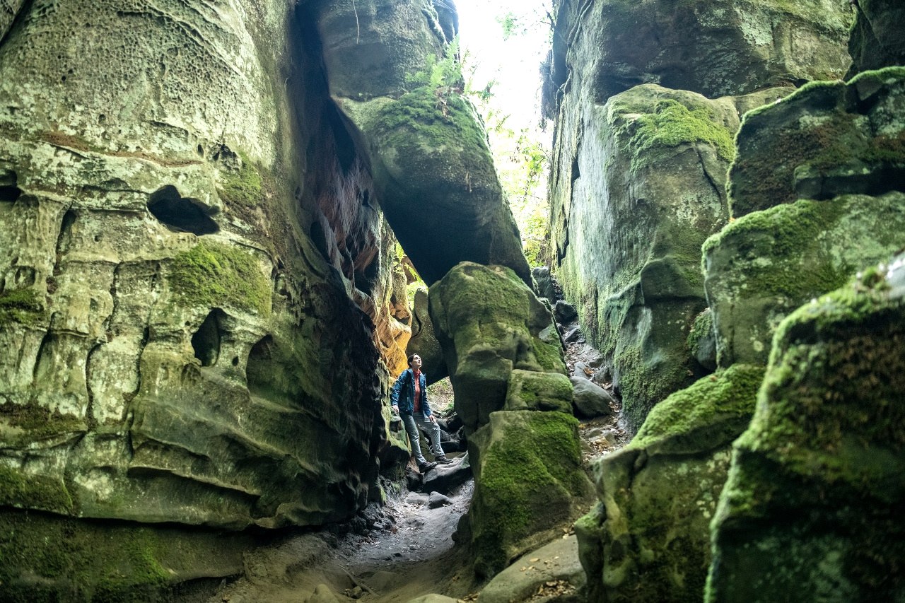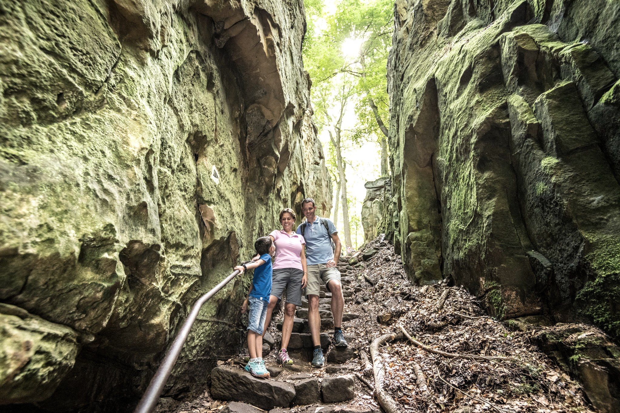 Kromme en kromme treden leiden naar beneden in de koele, vochtige kloof. Wees voorzichtig, buk je hoofd en wurm je door de smalle doorgang! Het is moeilijk te geloven dat dit zandsteen ooit een zeebodem was... We gaan verder langs een loopbrug en dan weer vele treden naar beneden tot het uitzicht zich opent in de beboste vallei.