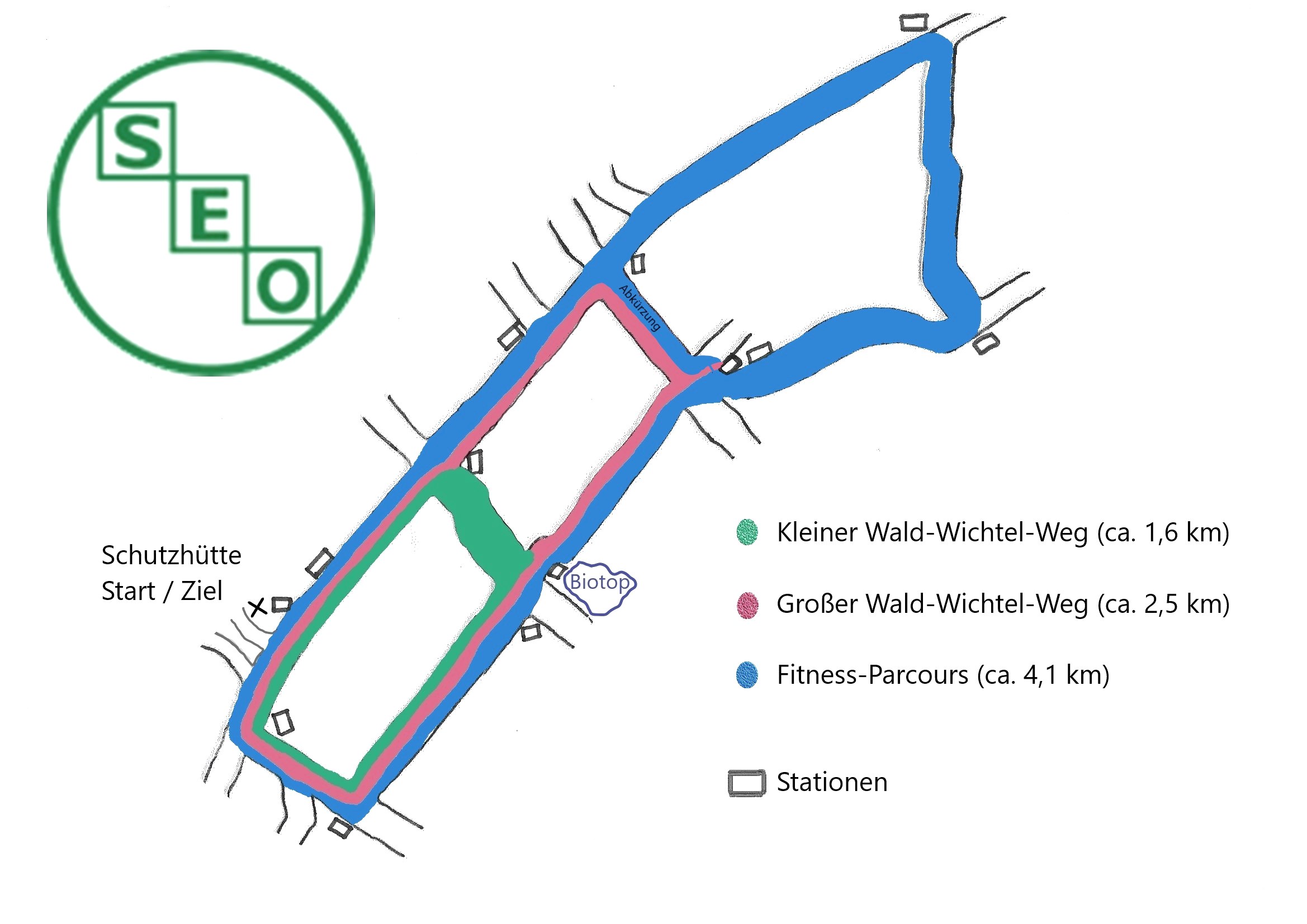 Op het boskabouterpad met twee verschillende lengtes (1,6 of 2,5 km) neemt boskabouter Theo iedereen mee op een spannende tocht door het Orenhofener bos en laat hij ze kennismaken met zijn bosvrienden. Op elk station wacht een nieuwe bosvriend met zijn favoriete sportoefening en interessante informatie.