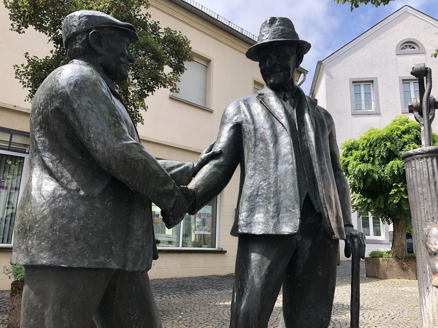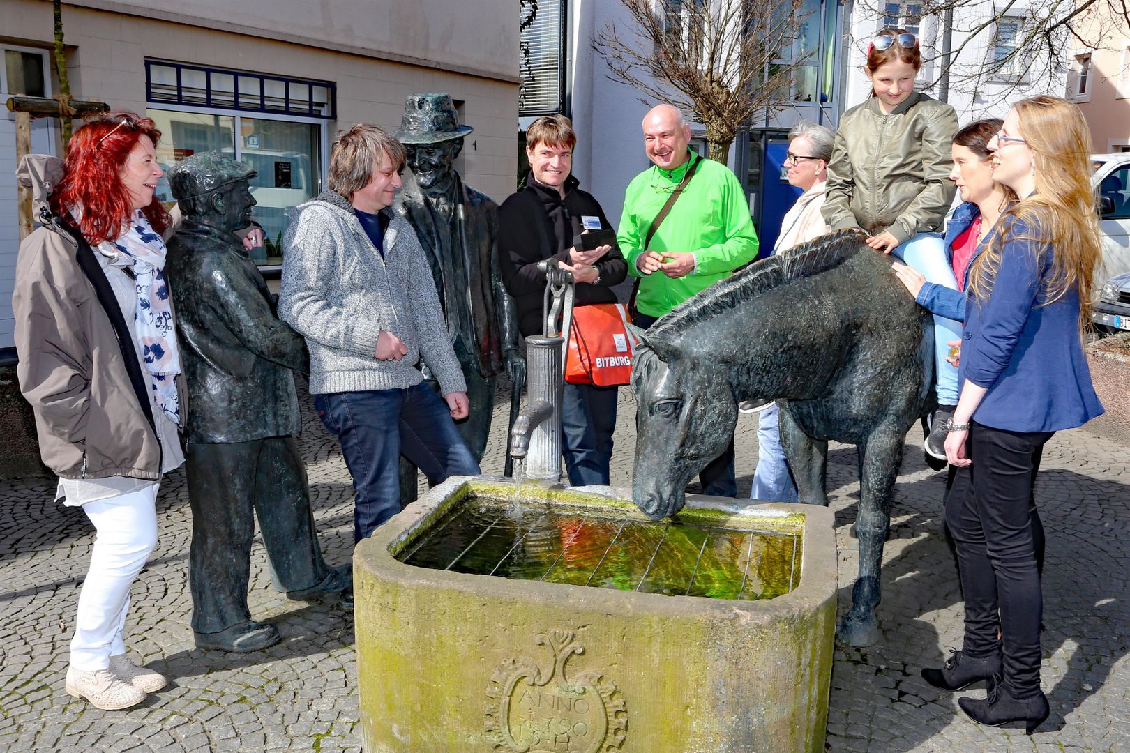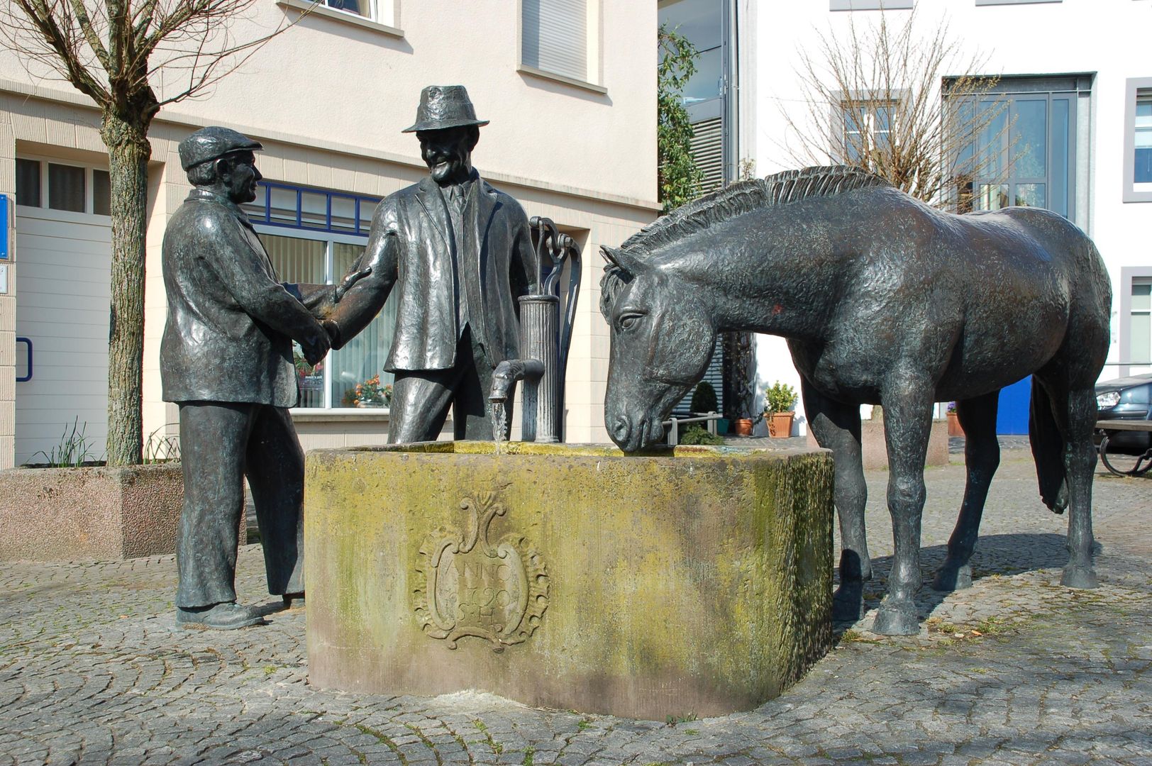 Die 1992 eingeweihte Bronzeplastik des Bitburger Bildhauers Roger Delleré stellt das Thema Pferdehandel dar. Sie erinnert an Zeiten, als regelmäßig abgehaltene Pferde- und Viehmärkte noch zum alltäglichen Geschehen in Bitburg zählten. Diese Märkte leisteten einen wichtigen Beitrag zum Aufschwung der Stadt. Das Kunstwerk zeigt zwei Bitburger „Originale“, Schillings Klaus und Jäschkes Fritz, die einen Pferdekauf per Handschlag besiegeln.