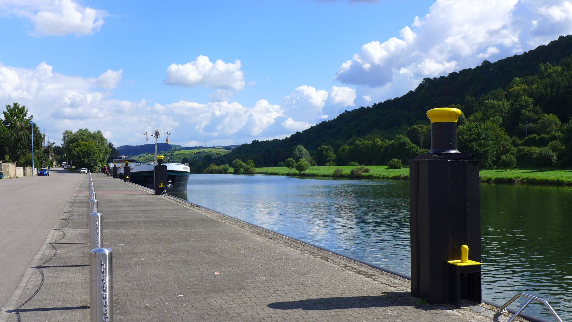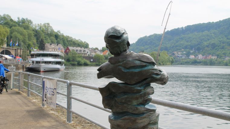 Wir gönnen uns noch kurz ein Selfie vor dem riesigen Mosaik, welches eine Sonnenuhr mit den Wasserläufen und Kantonen von Luxemburg darstellt und schlendern weiter, vorbei an den Anlegestellen für Boote und Schiffe sowie dem Fähranlieger zu den originellen Skulpturen vom Fischer.