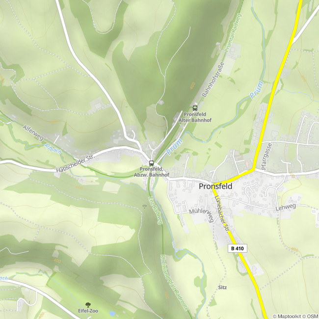 Schon von Weitem weist eine alte Museumslok den Weg zu dem kleinen Eisenbahnmuseum am Radweg in Pronsfeld. Dort wo einst die Züge der Westeifelbahn fuhren, sind auf den alten Bahntrasse heute RadfahrerInnen zwischen Prüm und St. Vith in Belgien unterwegs. Das Museum zeigt anhand von Fotos und Dokumenten an Schautafeln, die Geschichte der Eisenbahn in Pronsfeld seit 1886. Zusehen sind unter anderem eine Kleinlokomotive vom Typ Köf II mit Flachwagen, ein 3. Klasse Personenwagen aus dem Jahr 1940 sowie Bahnschranken, Gleisstücke, Formsignale und diverse bahnhistorische Geräte.