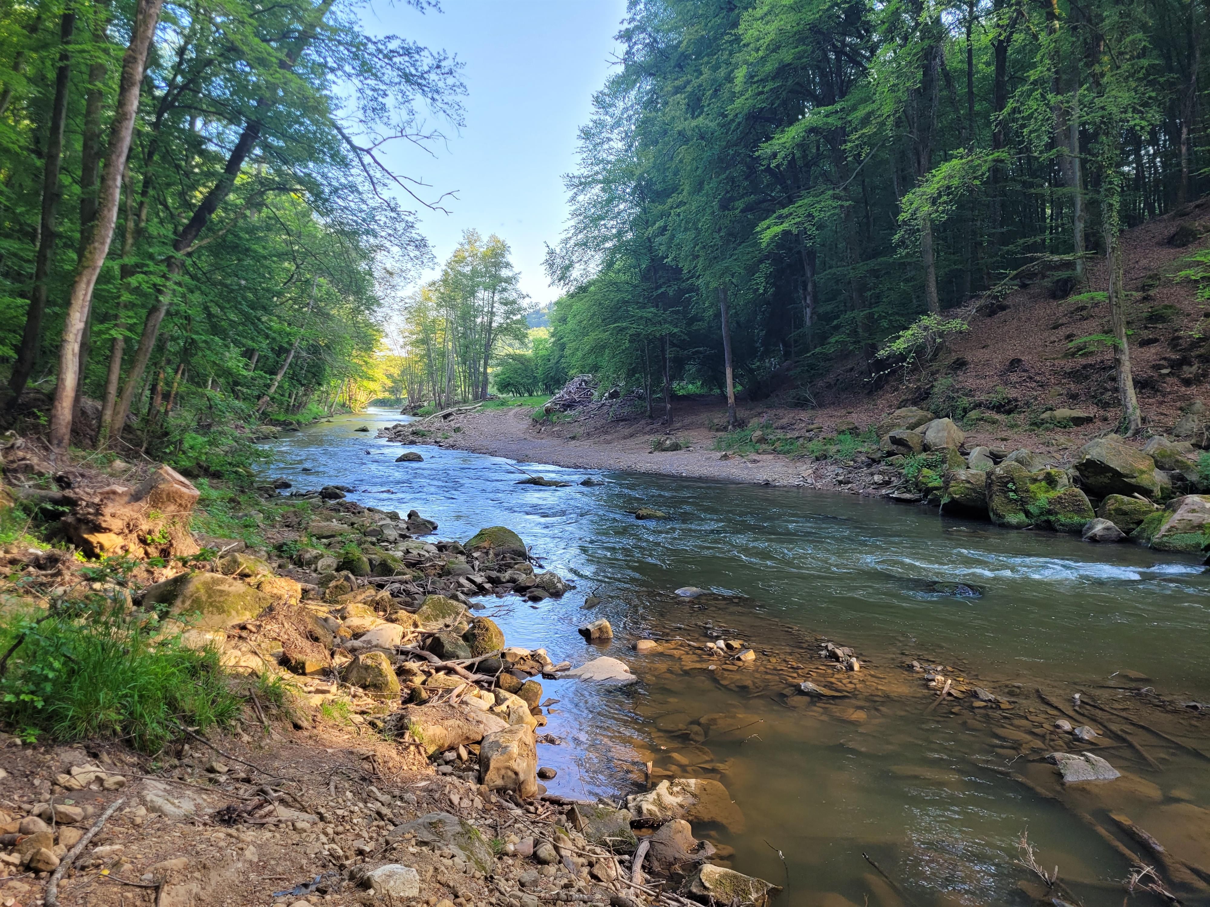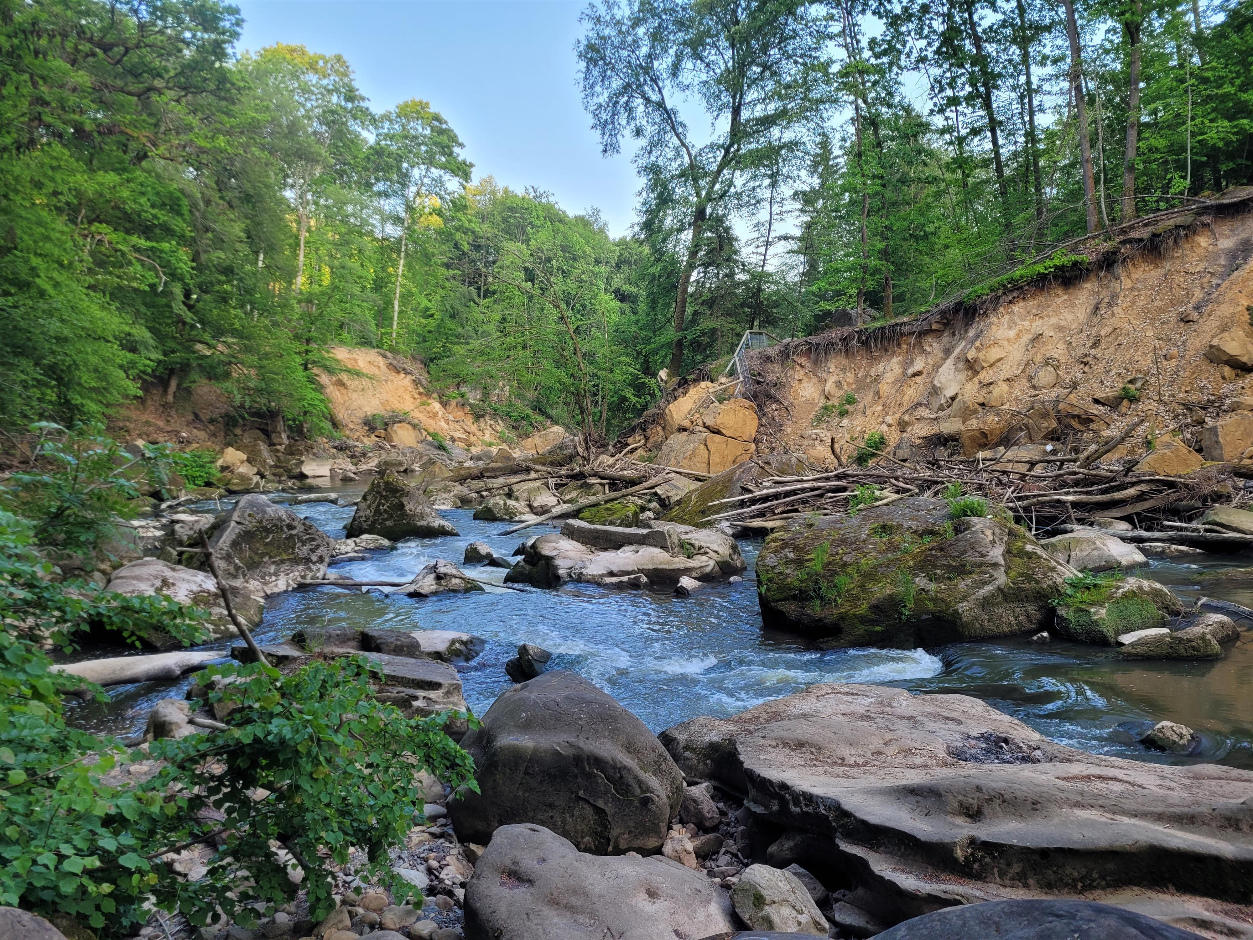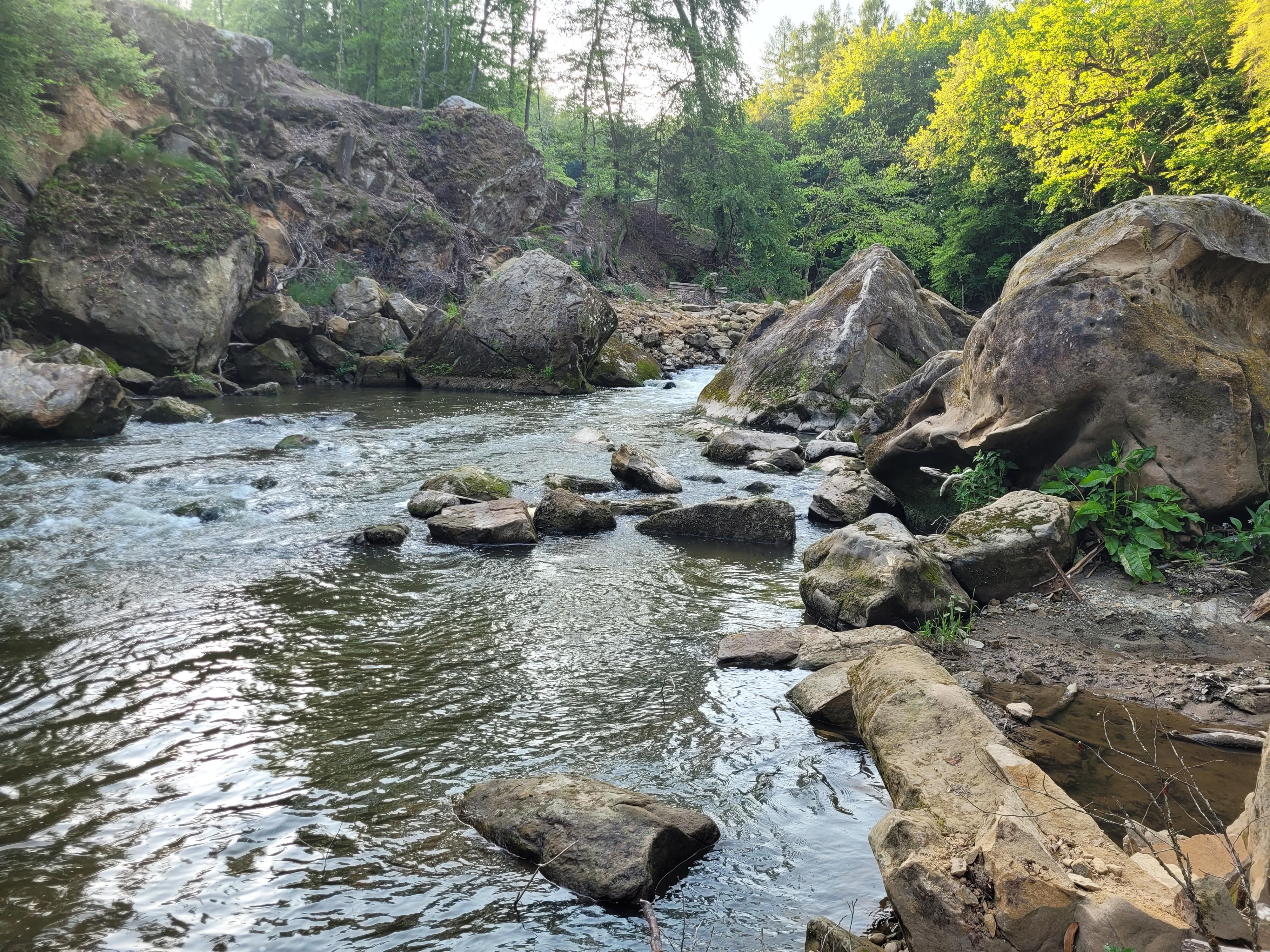 Häufig liest und hört man, die "Irreler Wasserfälle", die imposanten Stromschnellen der Prüm, gäbe es seit der Flutkatastrophe 2021 nicht mehr. Tatsächlich hat das Hochwasser in der Talenge, die der Fluss zwischen Irrel und Prümzurlay durchfließt, mehr als deutliche Spuren hinterlassen: Die Wassermassen haben nicht nur die überdachte Wanderbrücke zerstört, sondern auch ganze Felsblöcke verschoben, enorme Hangrutschungen verursacht, das Flussbett stark verändert und ein Meer von Steinen und Sand, entwurzelten Bäumen und Treibgut hinterlassen. Doch hat der Ort nichts von seiner Faszination verloren.