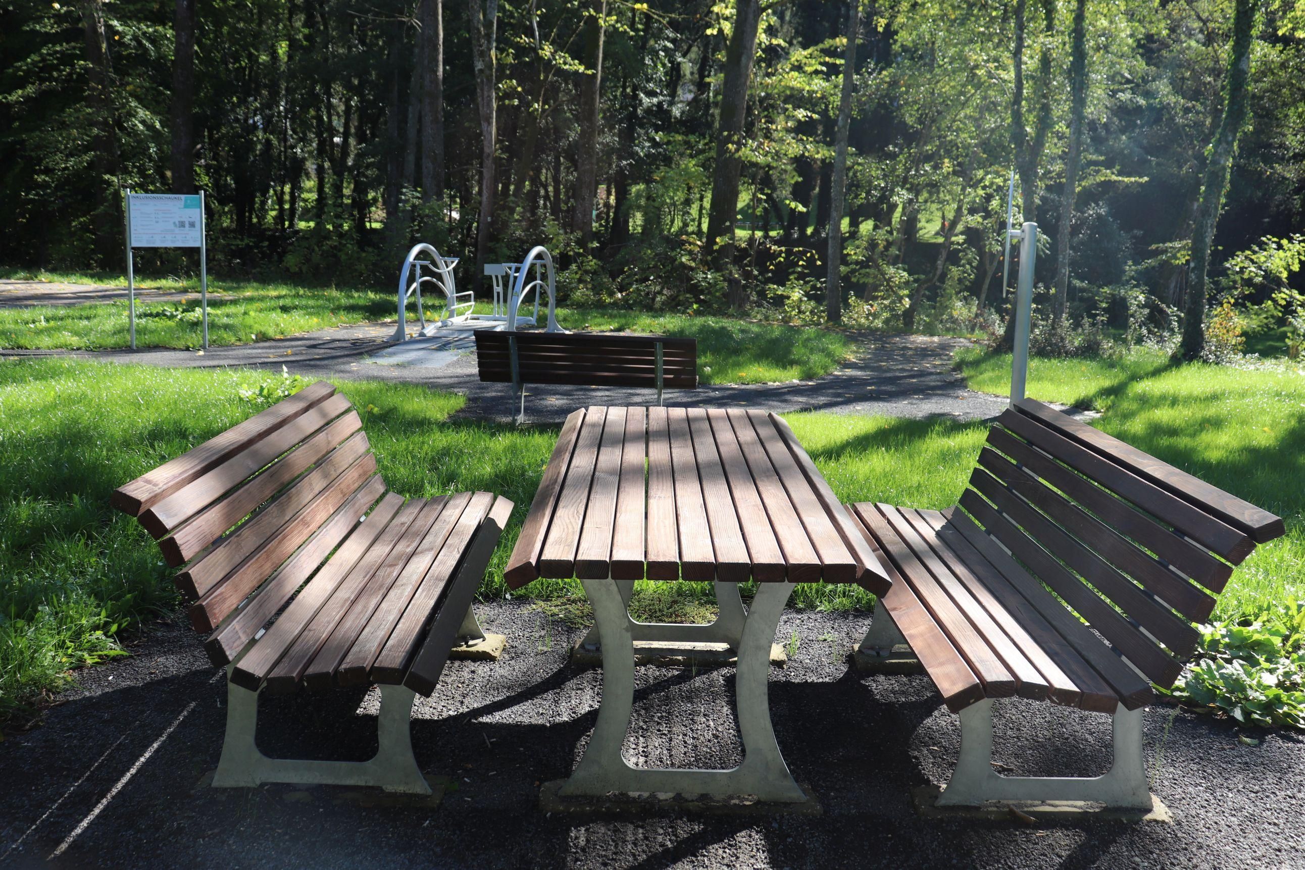 Mehrere Spielgeräte, wie z.B. ein Klangzaun, eine rotierende Scheibe, ein Kugellabyrinth und eine Schaukel für Rollstuhlfahrer sowie Sitzbänke laden zum Verweilen ein.