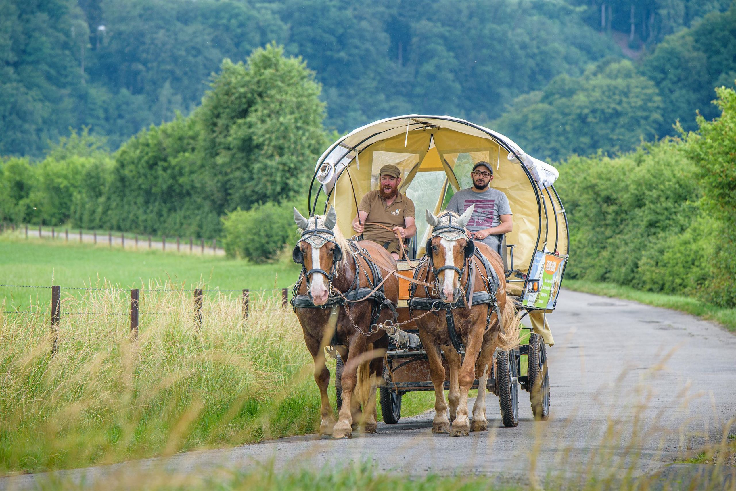 Und los geht’s im gleichmäßigen Tempo der Pferde vorbei an den Weiden unserer Tiere und durch die Wälder und über weite Felder.