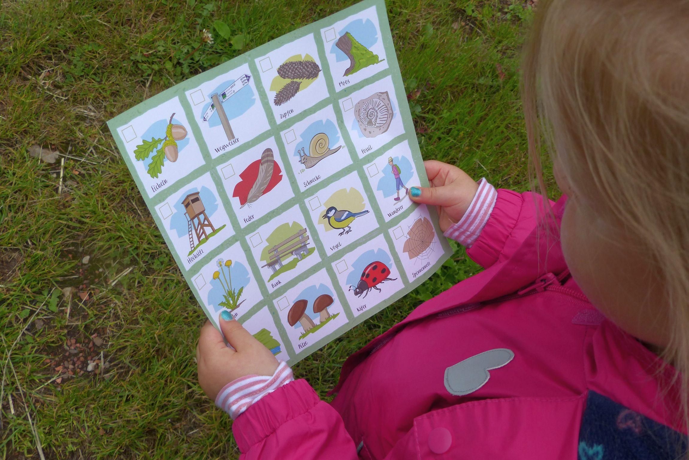 Wandern muss für Kinder nicht langweilig sein. Durch Wälder und Felder lässt sich die Natur spielerisch entdecken. Wer findet zuerst vier der gesuchten Dinge, die diagonal, vertikal oder horizontal eine Linie bilden und gewinnt damit das Spiel? Bach, Bank, Schnecke, Moos – Bingo!
