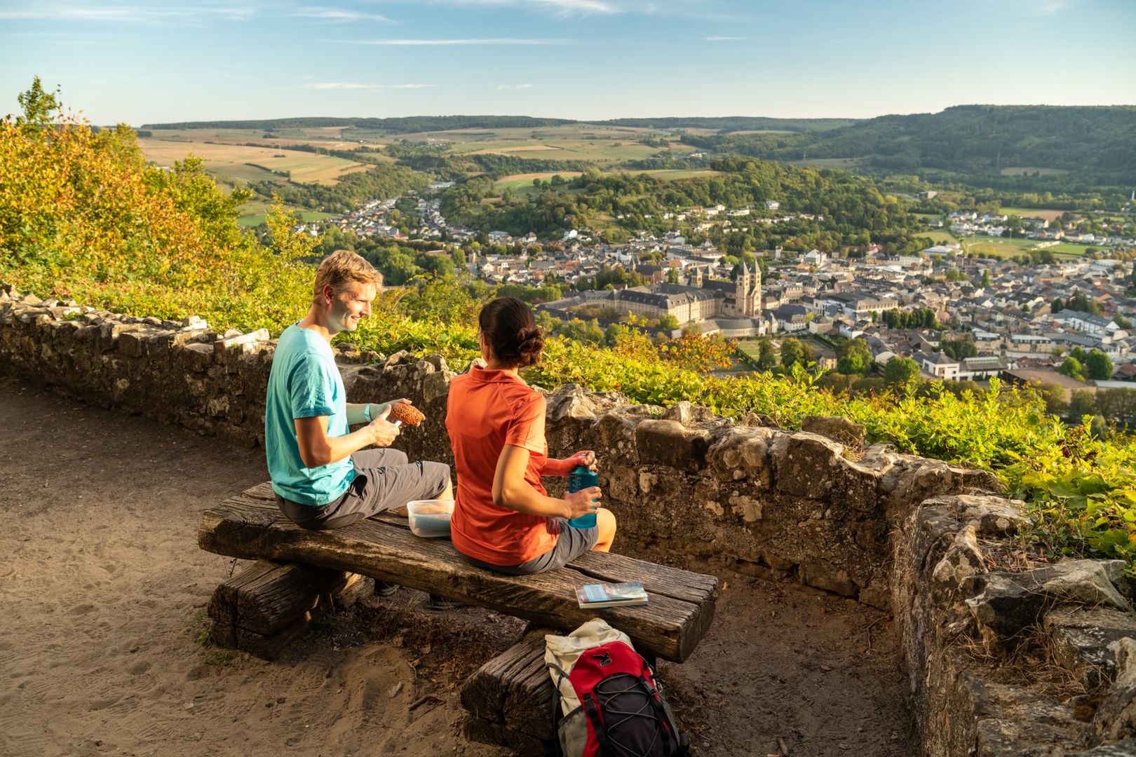 Hoch über der Stadt, am Trooskneppchen, empfängt euch am Einstieg zum Wald ein romantischer Pavillon aus Rundhölzern. Nehmt Platz und genießt die Aussicht. Das einstige Benediktinerkloster dominiert die Kulisse und lässt erahnen, wie mächtig einst die Äbte waren. Tief hat sich die Sauer in die mächtige Stufe des Luxemburgischen Sandsteins eingegraben und damit das Ferschweiler Plateau von der Luxemburgischen Schweiz getrennt. Heute markiert sie schlängelnd die Grenze nach Deutschland.