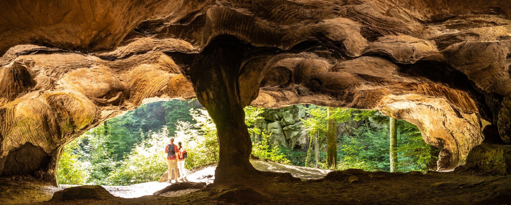 Die Wanderroute Felsenweg 1 im NaturWanderPark delux in der Südeifel startet in der ältesten Stadt Luxemburgs, in Echternach. Weithin schallen die neun Glocken aus den hoch aufragenden Türmen der Basilika, Stolz der ehemaligen Reichsabtei. Unter den strengen Blicken der herrschaftlich herausgeputzten Figuren an der Fassade des Denzelt – einst Versammlungsort, Gericht, Gefängnis und Folterkammer – geht es über den mittelalterlich anmutenden Marktplatz, dann durch eine Gasse mit zahlreichen Cafés bis zum Ortsrand, wo ein Pfad steil bergauf führt.