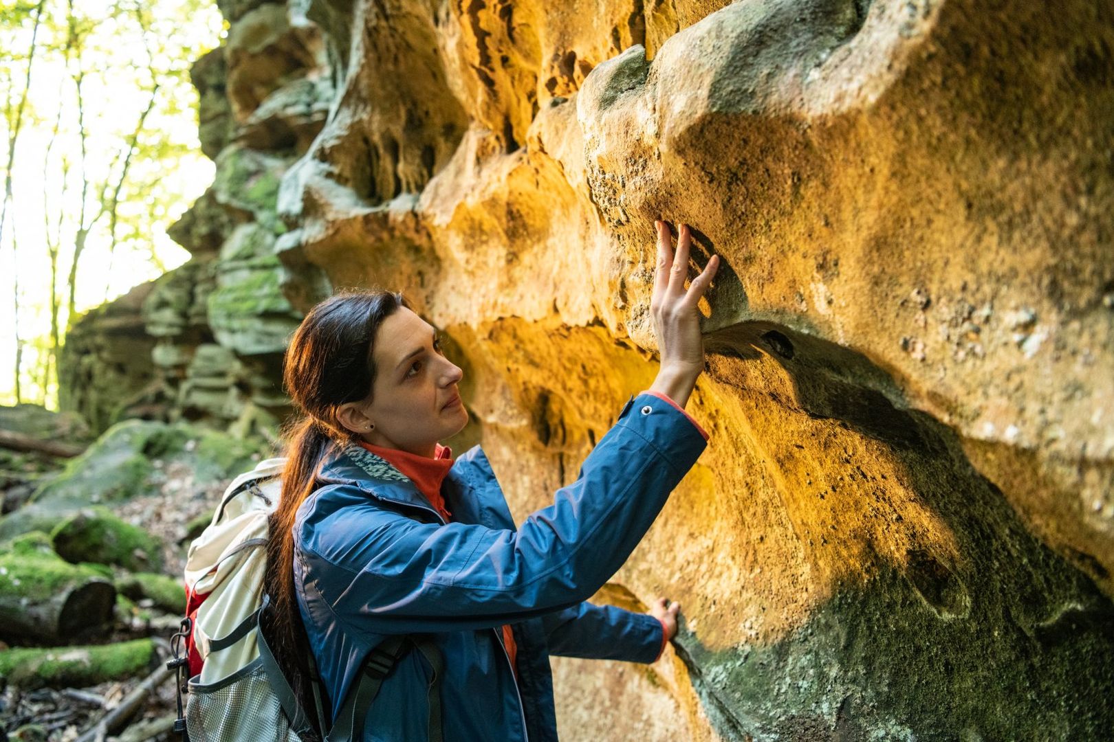 Startpunkt ist der Wanderparkplatz am Felsenweiher von Ernzen, der wie eine wundersame Bühne für Elfen und Nixen anmutet. Der erste Wegabschnitt führt durch Wald und umrundet das Ferschweiler Plateau an seiner Südflanke. Schon bald ragen die ersten Felswände der Stubenlay neben euch senkrecht auf. Oben auf dem Plateau angekommen, erreicht ihr die Kuckuckslay: eine kleine Felsbastion mit einem Durchkriechstein, um den sich allerhand Sagen ranken.
