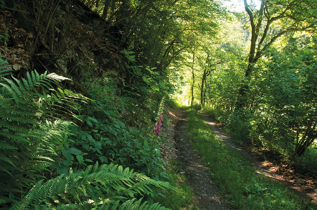 Die Rundwanderung beginnt am Wanderparkplatz Wehrbüsch bei Dahnen, nahe dem Gasthaus Waldesruh. Der Weg führt zunächst nordwärts und wechselt zwischen kurzen Waldstrecken, Waldrändern und Wiesenpassagen. Am nördlichen Zipfel geht es talwärts, und kurz vor einer Mühle wechselt der Pfad auf die andere Bachseite. Der Pfad bleibt nahe an der Irsen und führt durch eine idyllische Auenlandschaft. An einigen Stellen sind kleine Staudämme zu entdecken, die von Bibern errichtet wurden, die hier wieder heimisch sind. Mit etwas Glück lassen sich diese fleißigen Landschaftsgestalter in der Nähe ihrer Burgen beobachten. Am Südzipfel der Route wird es spannend: Nahe der Siedlung Haustrich muss die Irsen über Trittsteine im Wasser überquert werden, und anschließend geht es über eine Leiter am Hang wieder hinauf auf den Weg. Der weitere Weg führt nordwestwärts, umrundet zwei Fischteiche und folgt einem Forstweg, bevor er wieder im Hangwald ansteigt. Der kühle Wald bietet immer wieder Ausblicke ins sonnengeflutete Tal mit der sich windenden Irsen.