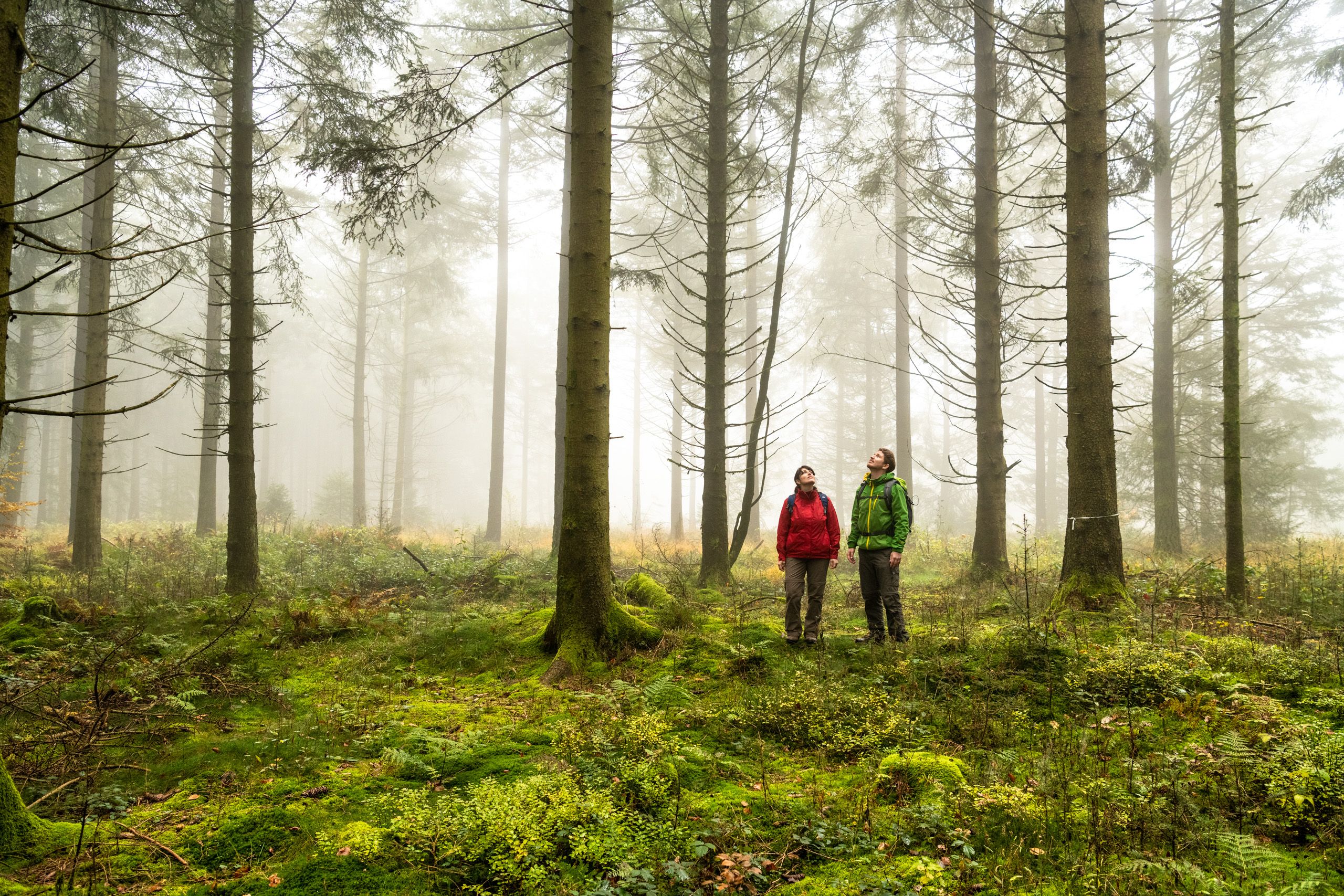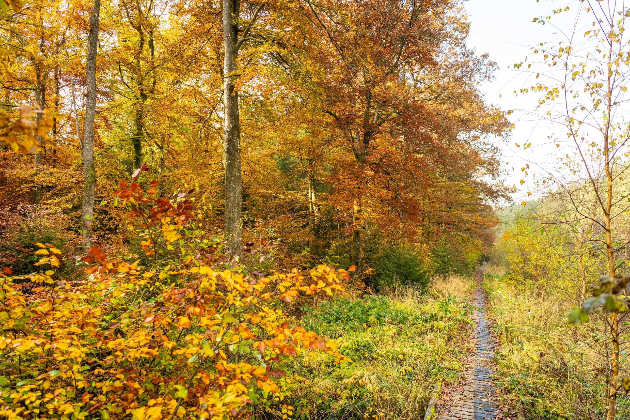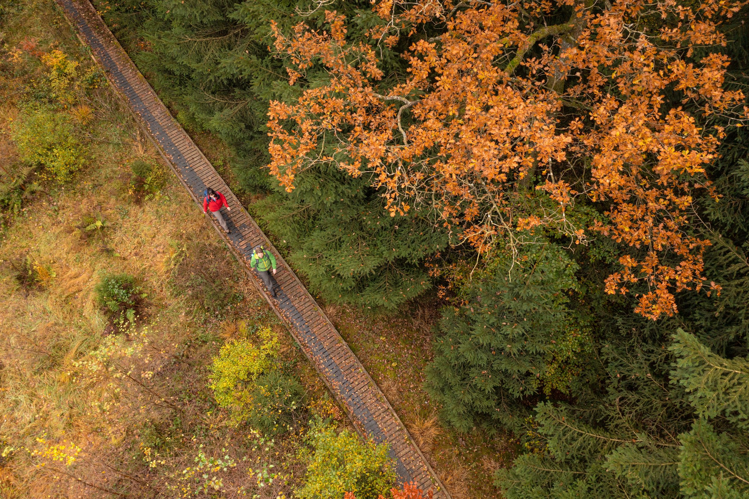 Auf gewundenen Pfaden führt der Wanderweg euch tief in den höchsten Wald des Naturparks Nordeifel. Verwunschen und mystisch kommt er daher. Weiche grüne Moosteppiche drapieren den Waldboden, durchsetzt von Blau- und Moosbeerbüschen. Vereinzelte Sonnenstrahlen durchdringen das dichte Geäst, zeichnen Muster in Gelb-Orangetönen auf die Rinde der Bäume. An überraschend vielen Stellen entdeckt Ihr überwucherte Bunkerruinen, die sich bei genauem Hinsehen aus dem Halbdunkel des Waldes schälen. Es sind dies Relikte des Westwalls, errichtet in dunklen Zeiten, als der Schneifelrücken noch kahl war.